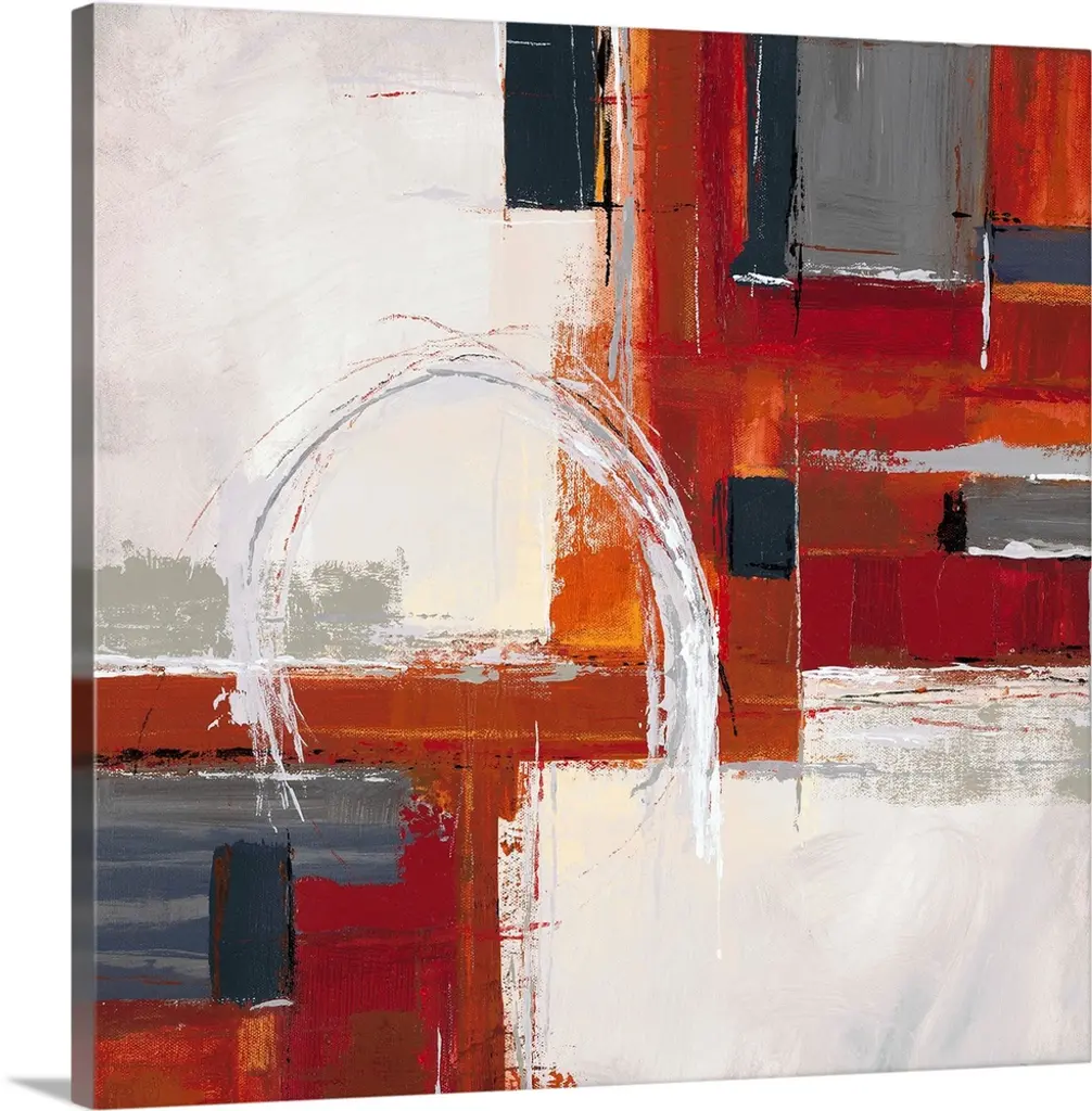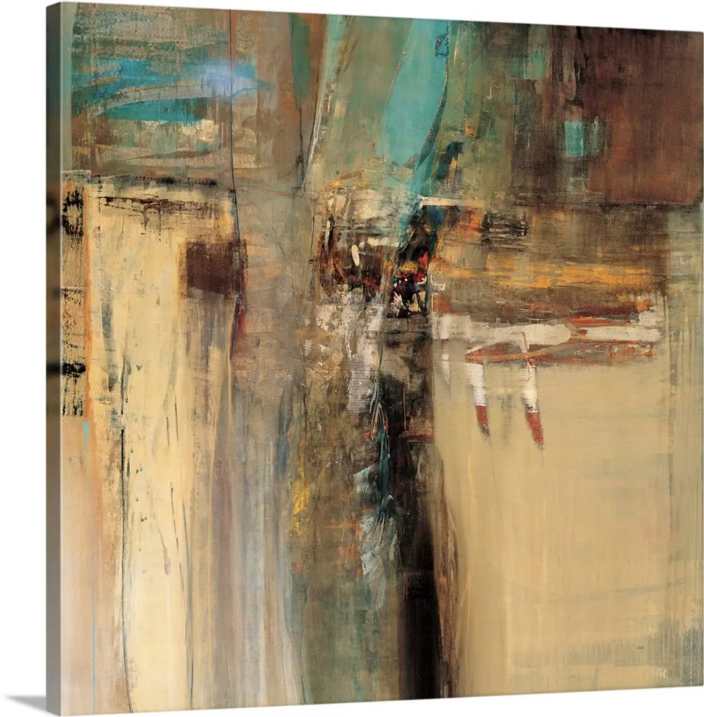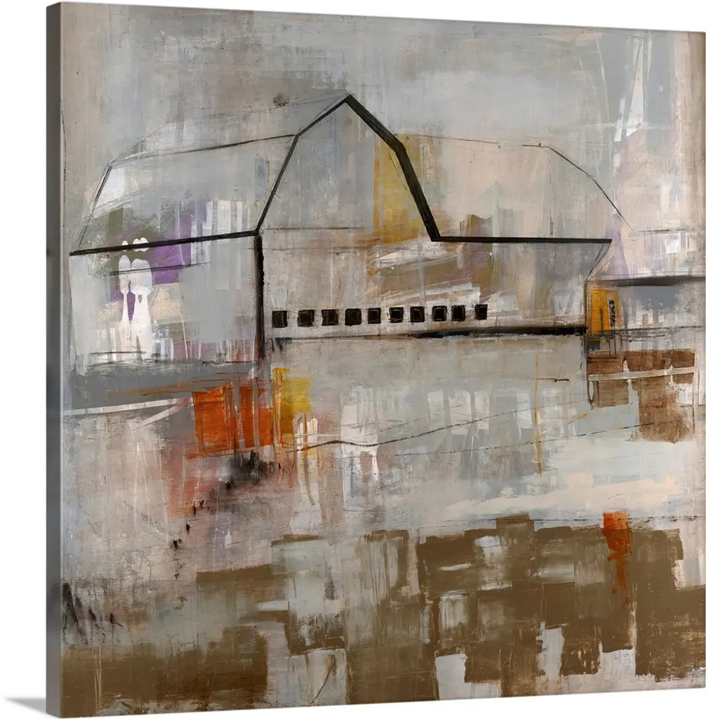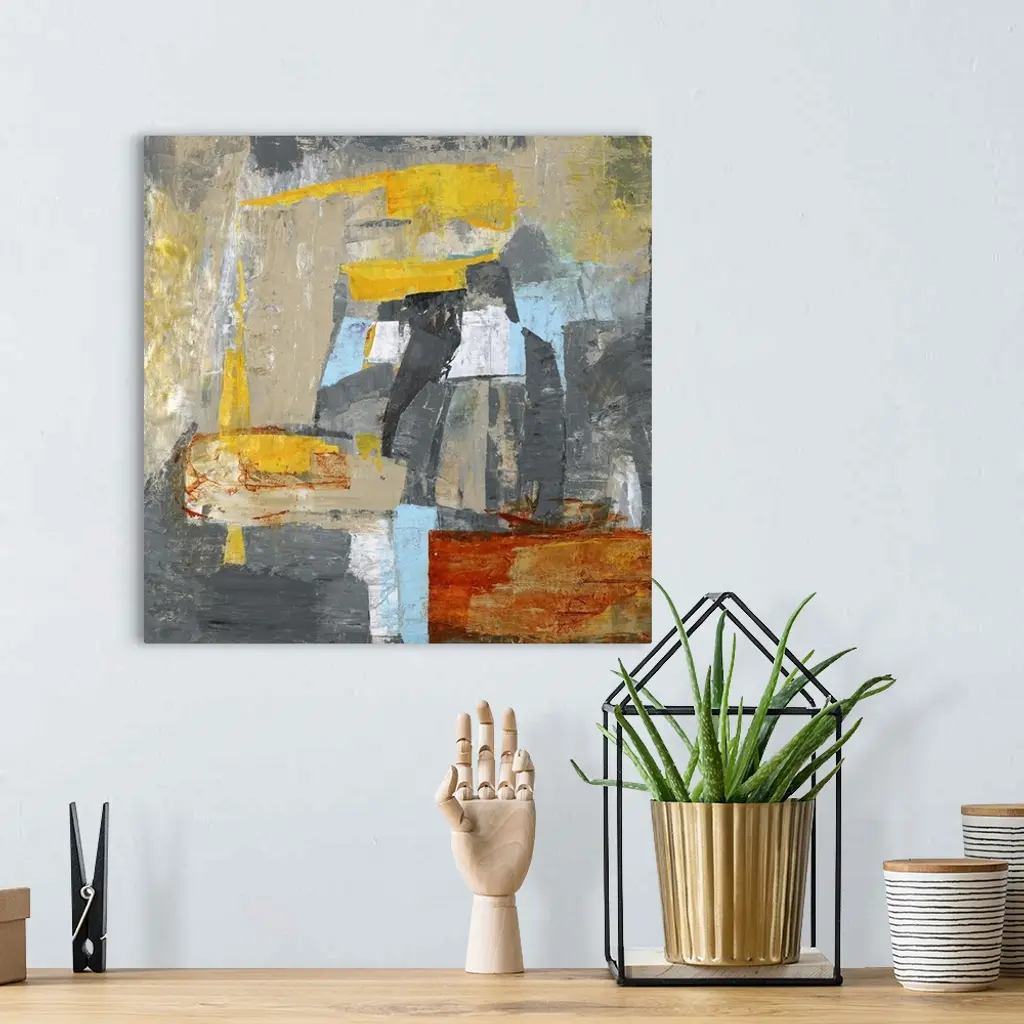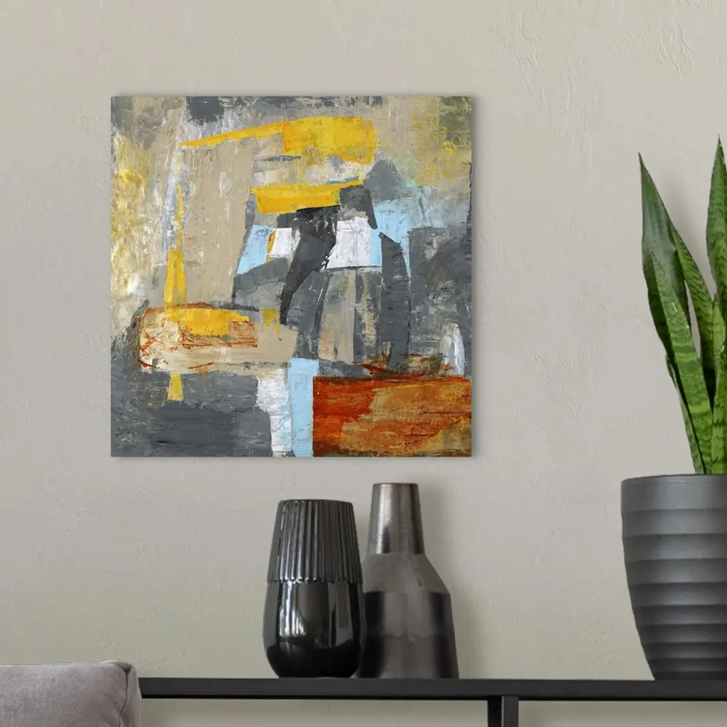 Contemporary abstract artwork in grey and blue with pops of bright yellow.