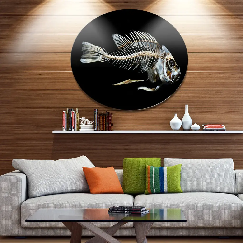 Bring Contemporary Abstraction to your home with this large Circle Metal wall art. This Fish Skeleton Bone on Black Metal Artwork makes it the focal point of any room or office. - White Gloss Coating ensures colors are extra vibrant with light reflection.- Aluminum grade Sheet Metal with 1 inch mounting frame on the back giving the illusion that the artwork is floating on the wall..- Mounting Brackets are included along with instructions.- High Quality Digital images are created directly into a glossy aluminum panel producing a stunning and captivating print into the glossy finish of the metal.- Water, Fire and Scratch resistant HD Aluminum panels.- Looks better than any photo paper and guaranteed to last at least 20 years- Easy to clean with a microfiber cloth. Colors are far superior to regular Canvas Art. - Easy to Hang
