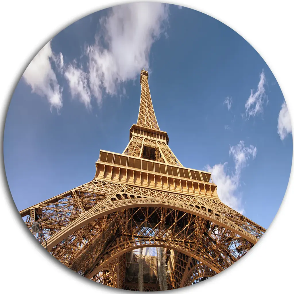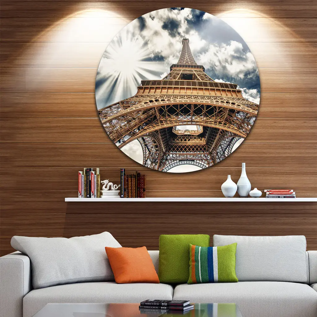 Bring Contemporary Abstraction to your home with this large Circle Metal wall art. This Fisheye View of Eiffel Tower Metal Artwork makes it the focal point of any room or office. - White Gloss Coating ensures colors are extra vibrant with light reflection.- Aluminum grade Sheet Metal with 1 inch mounting frame on the back giving the illusion that the artwork is floating on the wall..- Mounting Brackets are included along with instructions.- High Quality Digital images are created directly into a glossy aluminum panel producing a stunning and captivating print into the glossy finish of the metal.- Water, Fire and Scratch resistant HD Aluminum panels.- Looks better than any photo paper and guaranteed to last at least 20 years- Easy to clean with a microfiber cloth. Colors are far superior to regular Canvas Art. - Easy to Hang