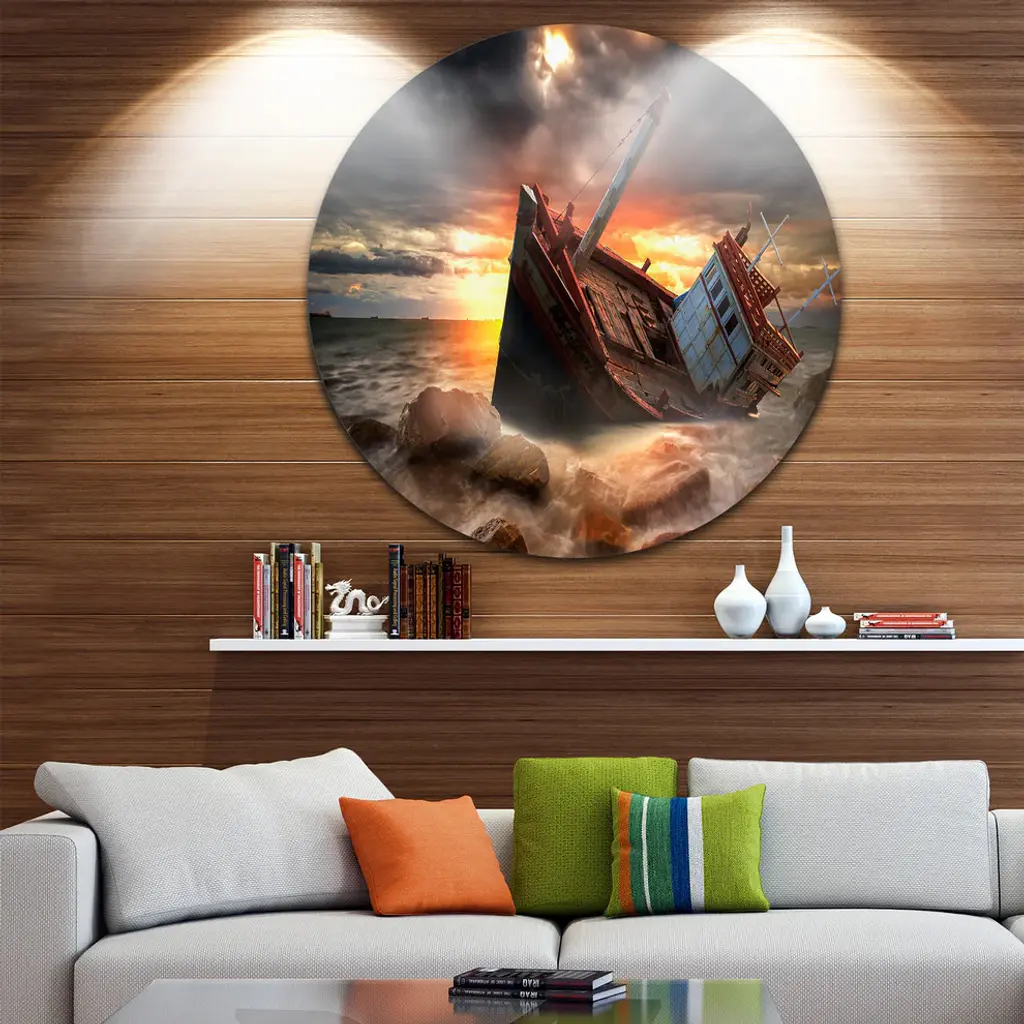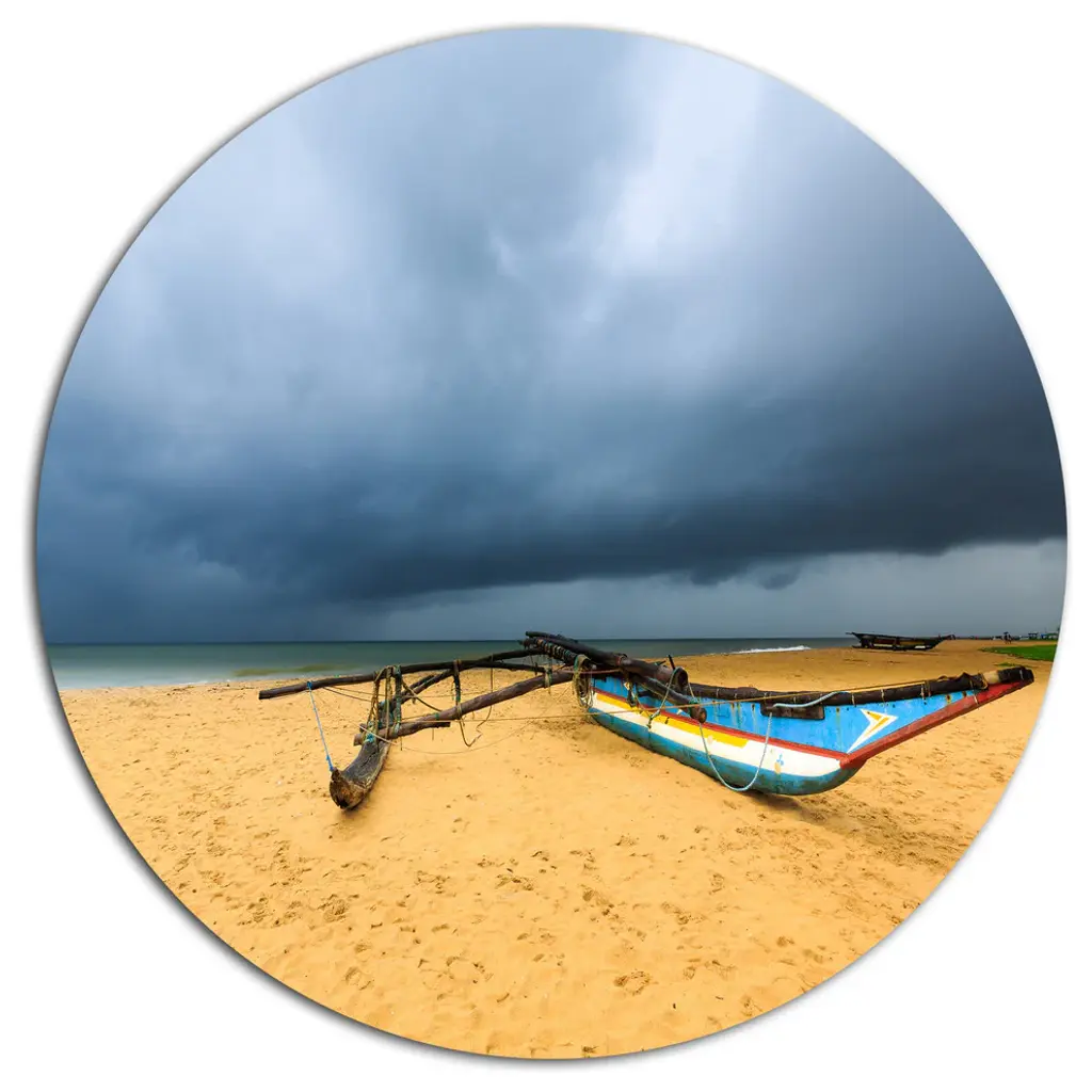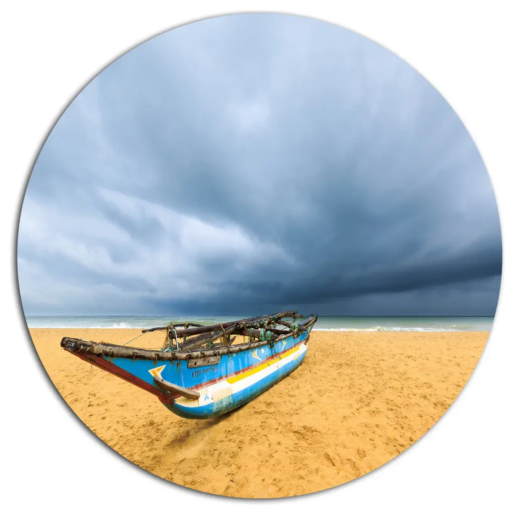 Bring Contemporary Abstraction to your home with this large Circle Metal wall art. This Fishing Boat Beached Metal Artwork makes it the focal point of any room or office. - White Gloss Coating ensures colors are extra vibrant with light reflection.- Aluminum grade Sheet Metal with 1 inch mounting frame on the back giving the illusion that the artwork is floating on the wall..- Mounting Brackets are included along with instructions.- High Quality Digital images are created directly into a glossy aluminum panel producing a stunning and captivating print into the glossy finish of the metal.- Water, Fire and Scratch resistant HD Aluminum panels.- Looks better than any photo paper and guaranteed to last at least 20 years- Easy to clean with a microfiber cloth. Colors are far superior to regular Canvas Art. - Easy to Hang