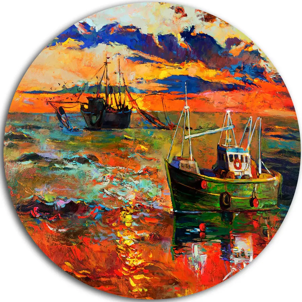 Fishing Boat In Red Hue, Seascape Panting Round Wall Art, 36"