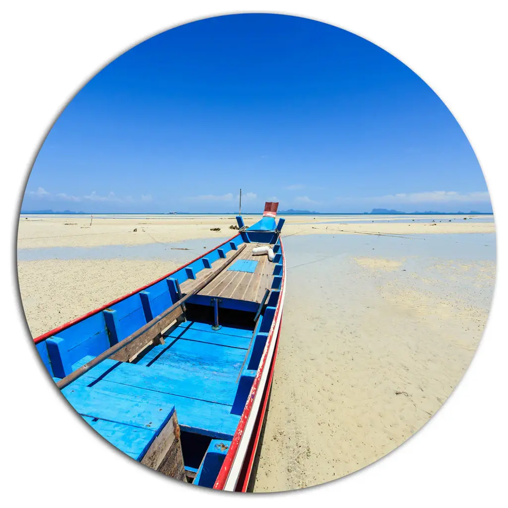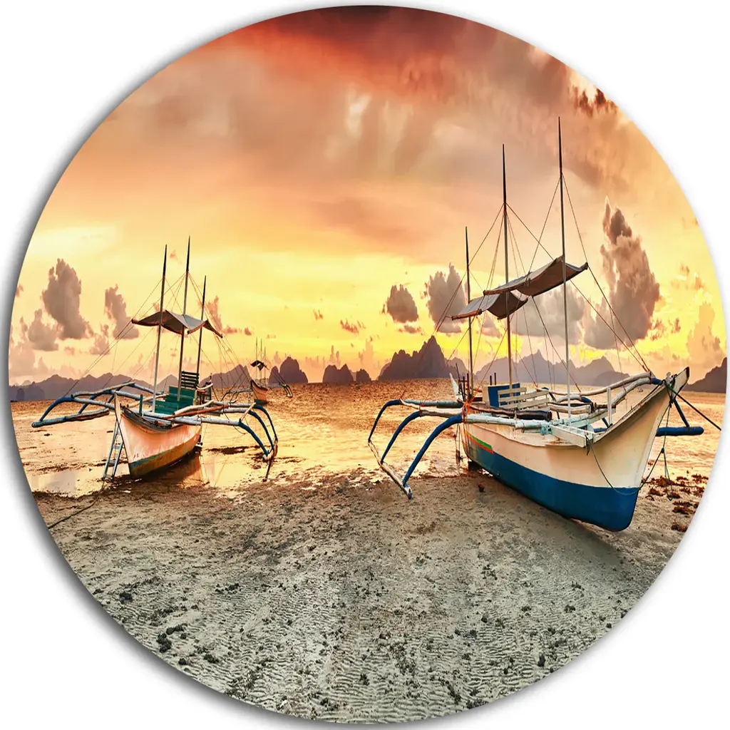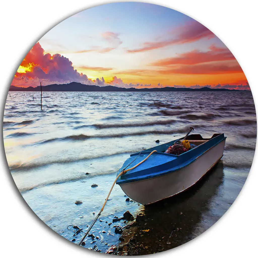 Bring Contemporary Abstraction to your home with this large Circle Metal wall art. This Fishing Boat in Sri Lanka Beach Metal Artwork makes it the focal point of any room or office. - White Gloss Coating ensures colors are extra vibrant with light reflection.- Aluminum grade Sheet Metal with 1 inch mounting frame on the back giving the illusion that the artwork is floating on the wall..- Mounting Brackets are included along with instructions.- High Quality Digital images are created directly into a glossy aluminum panel producing a stunning and captivating print into the glossy finish of the metal.- Water, Fire and Scratch resistant HD Aluminum panels.- Looks better than any photo paper and guaranteed to last at least 20 years- Easy to clean with a microfiber cloth. Colors are far superior to regular Canvas Art. - Easy to Hang
