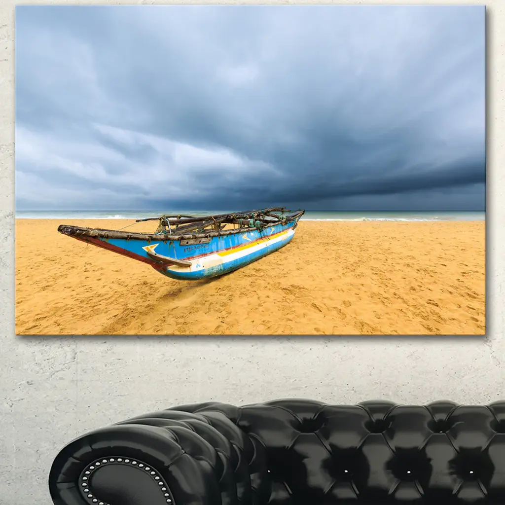 Fishing Boat On Beach With Dark Clouds, Seashore Canvas Art Print, 60"x28"