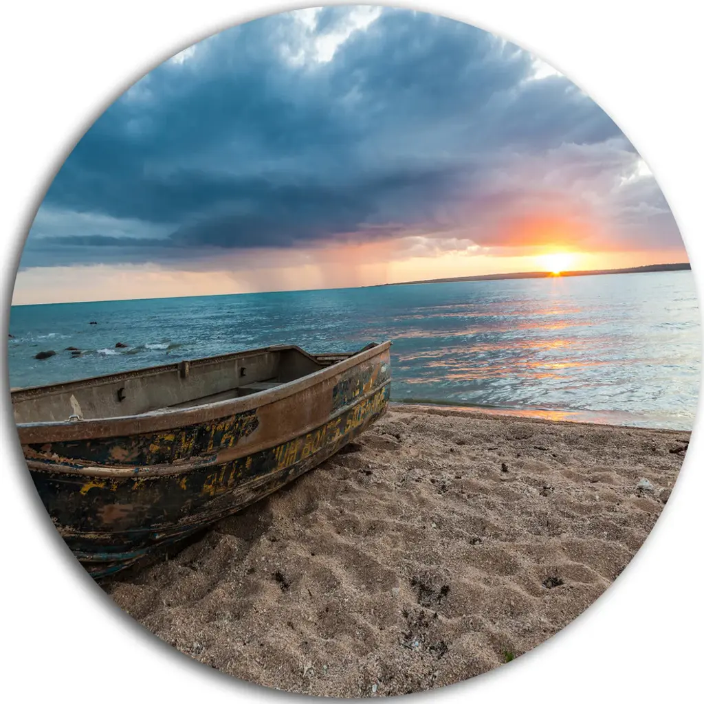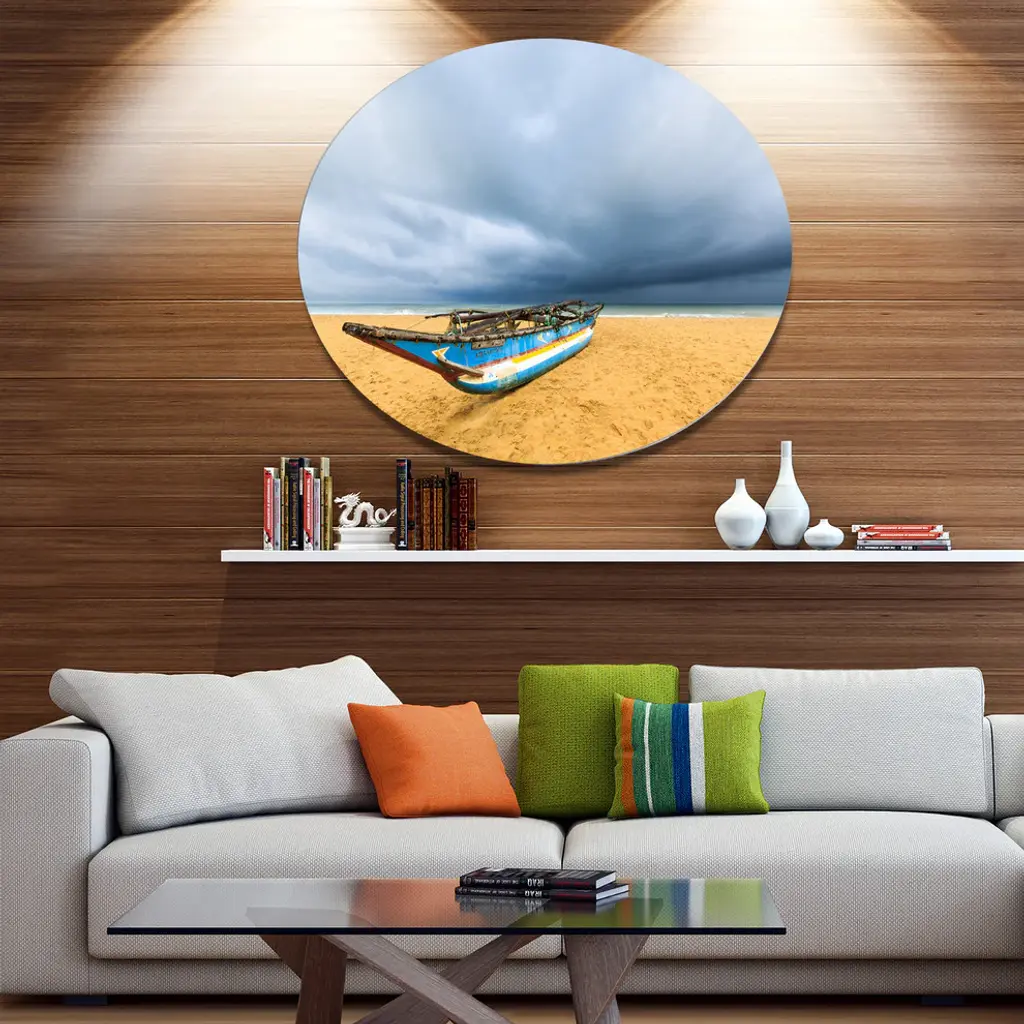 Fishing Boat On Beach With Dark Clouds, Seashore Round Wall Art, 36"