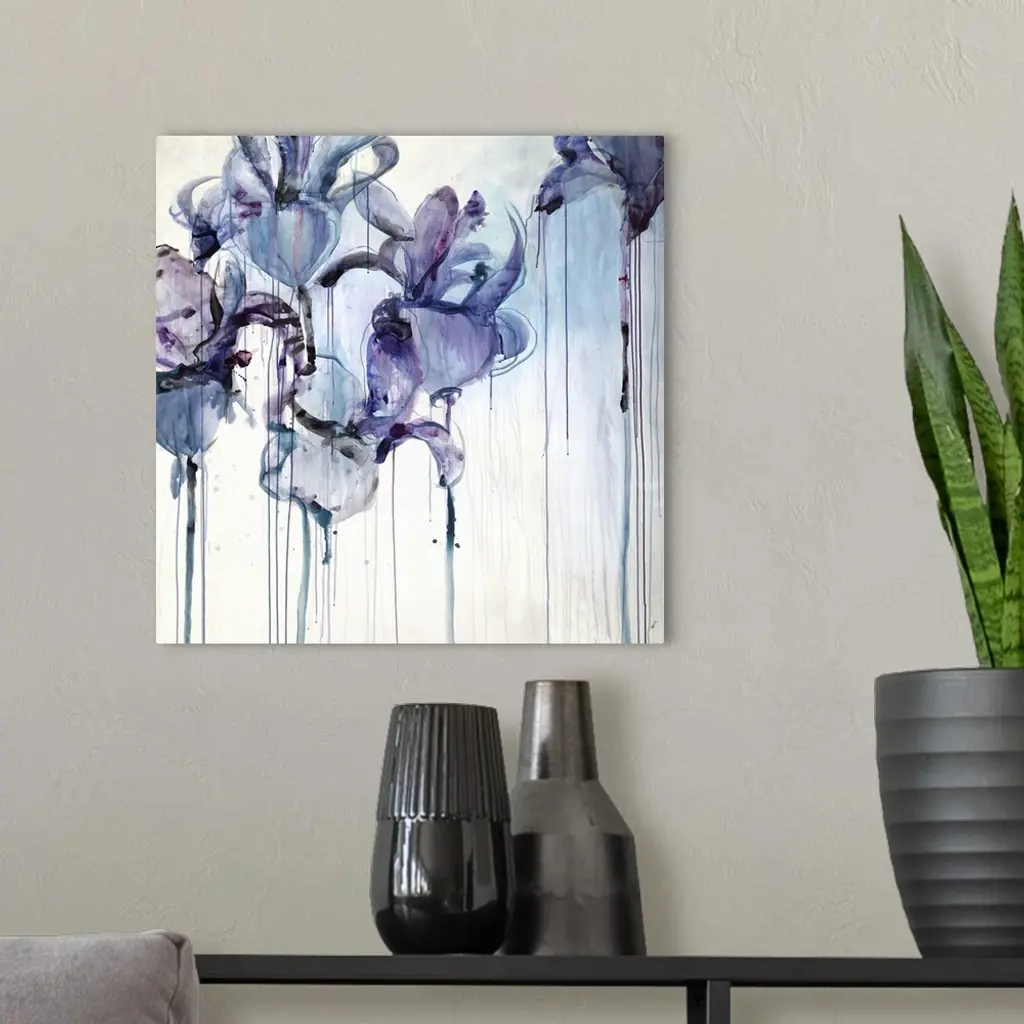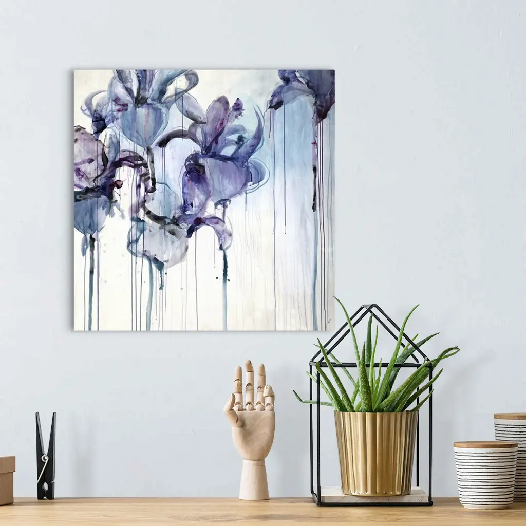 Abstract floral painting of five iris blooms with drips of paint running down.