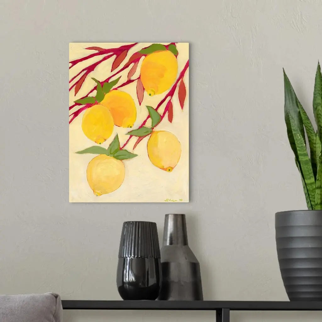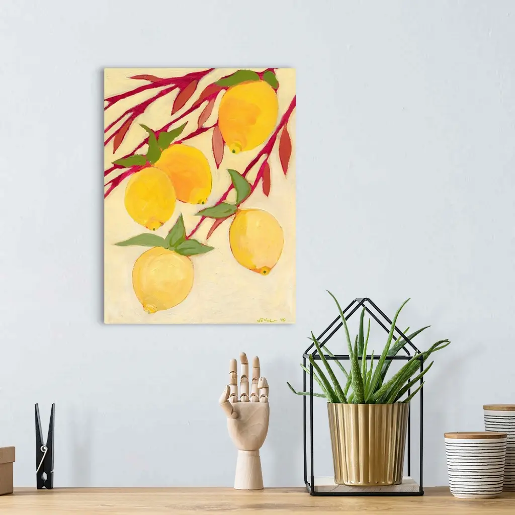 Fine art painting of five brightly colored lemons hanging off a tree branch. Vibrant colors dominate.