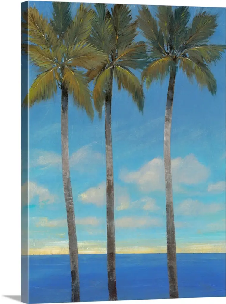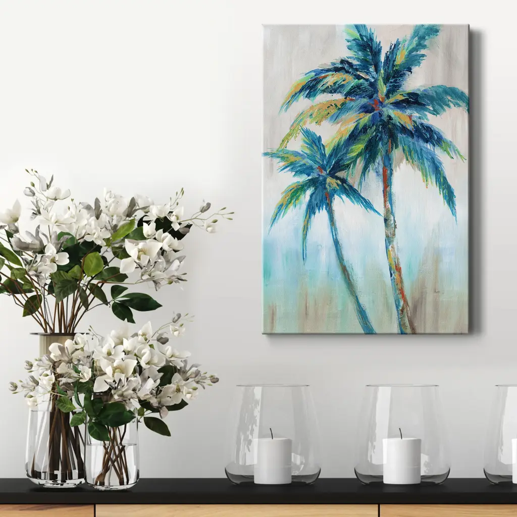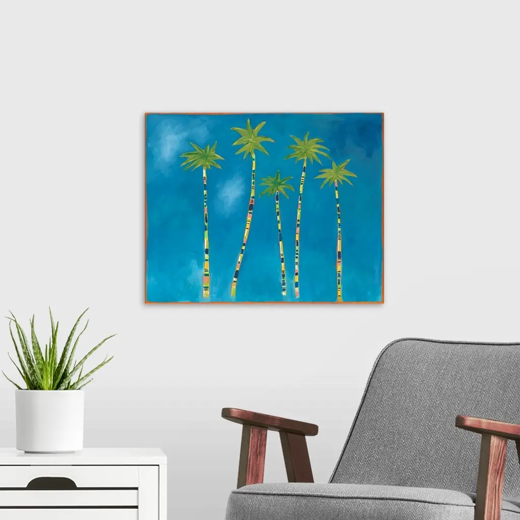 A contemporary painting of a group of palm trees with multi-colored tree trunks and bright green leaves against of brilliant blue sky.