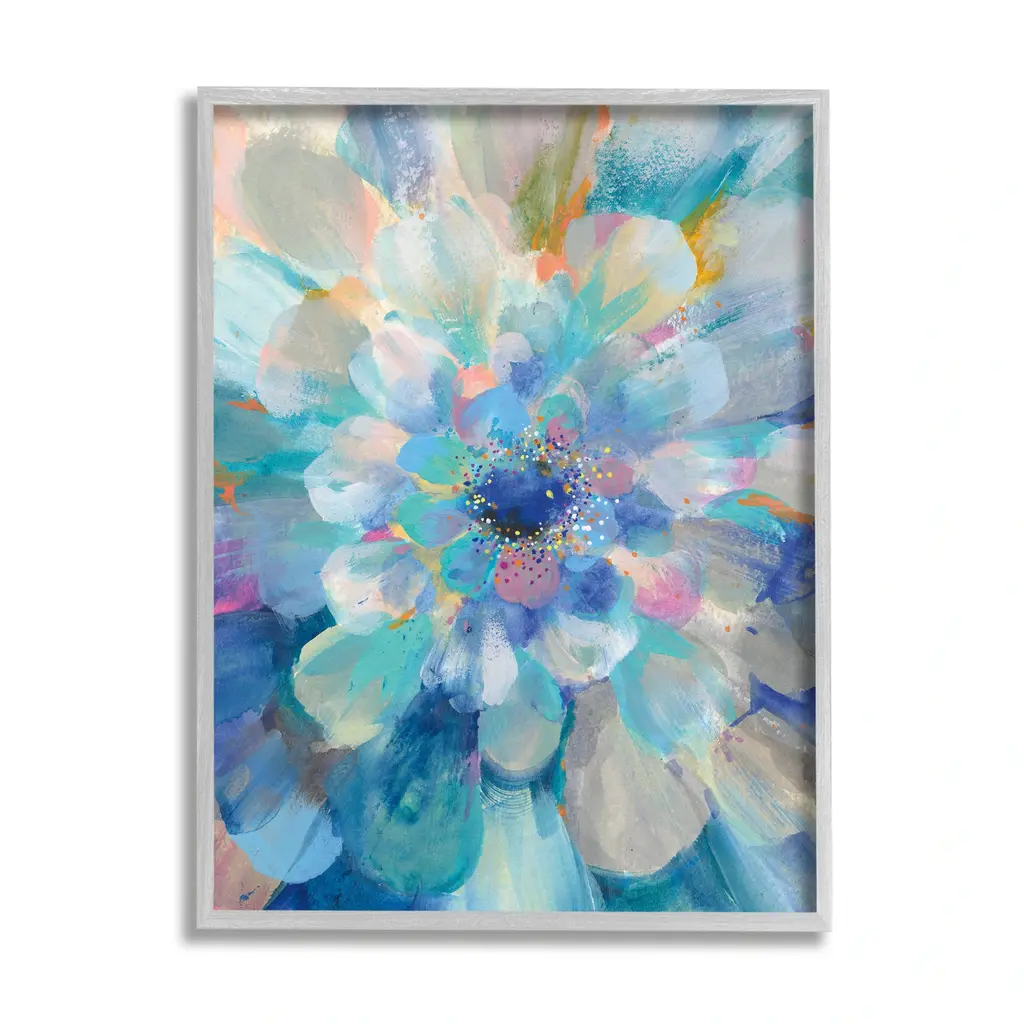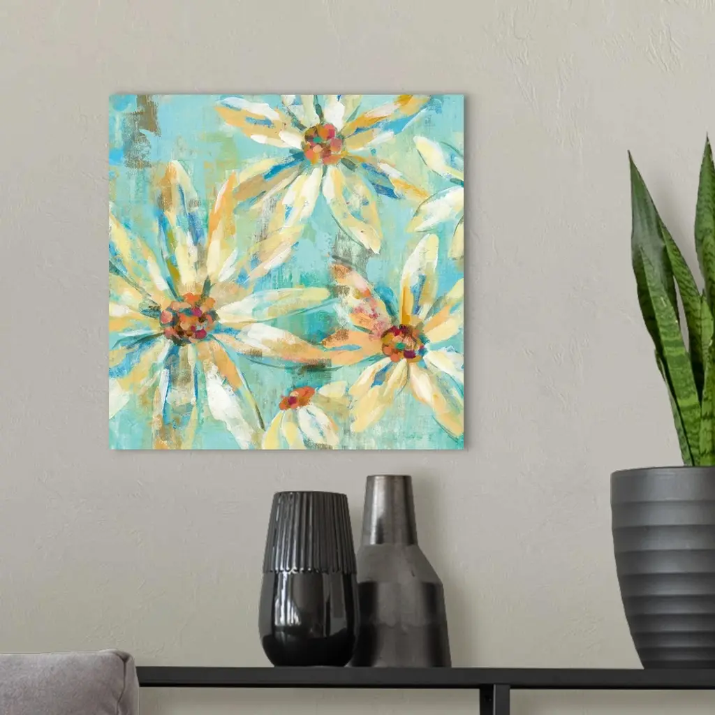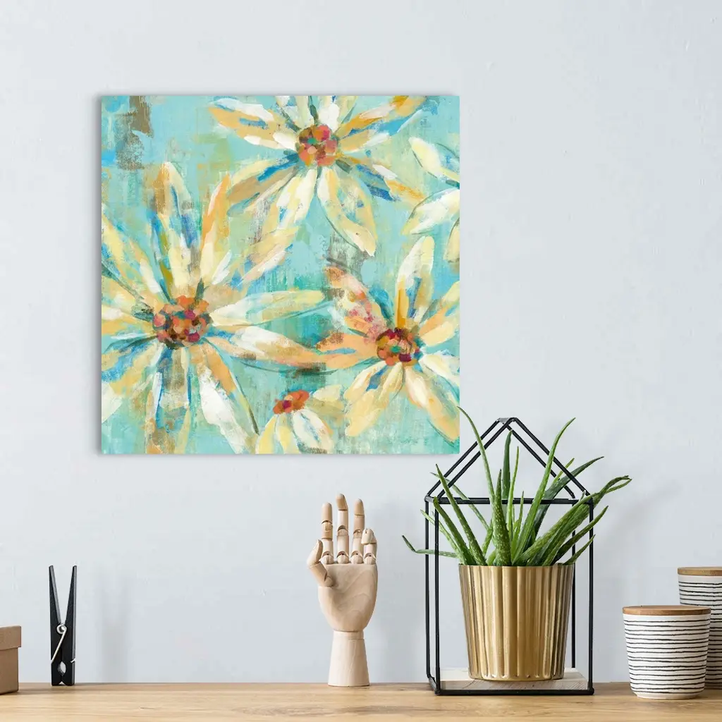 Contemporary painting of white flowers against a light blue background.
