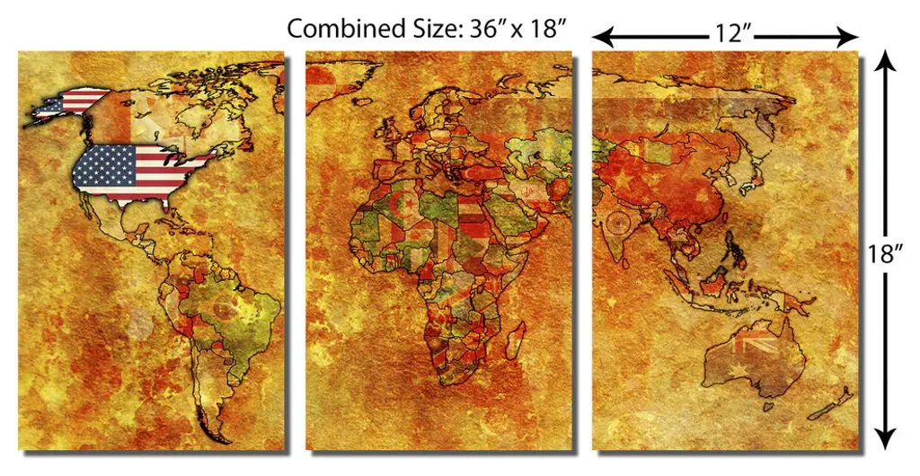 36"œ x 18"œ total size. Ready To Hang! (3 pieces - 12"œ x 18"œ each). 3 Panel Split (Triptych) Word Map Metal Print with country flags. Modern metal wall art for home or office wall decor & interior design. Printed on Luxurious, HD aluminum glossy metal panels. Multi panel art.. HD aluminum panels. Metal print wall art. Includes Shadow Wall Mount on the back.• Aluminum Metal Wall Art• Made in USA• Ready to hang - No assembly required• Shadow mount hardware on the back• 0.045"œ thick HD Aluminum Panels• Scratch resistant, glossy finish• Superb color clarity, luxurious prints• Epson printing process• For indoor or moisture rich environment use• Easy to clean. Gently wipe with microfiber cloth.