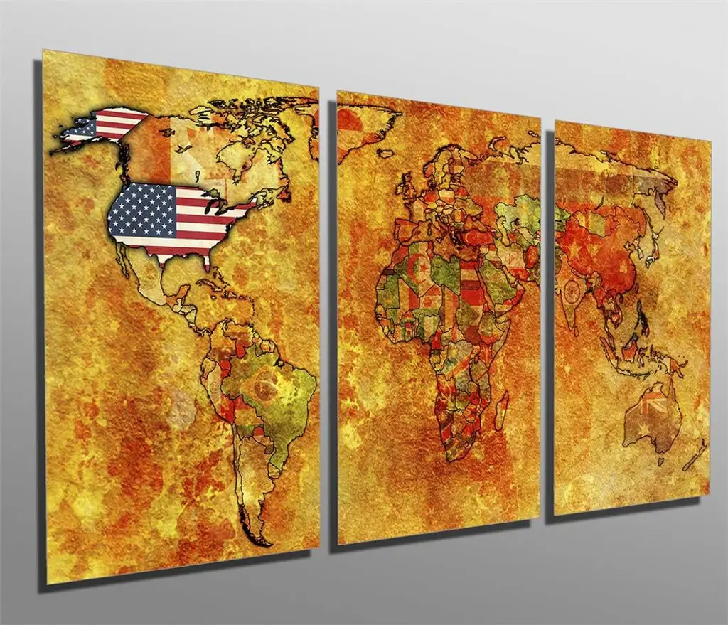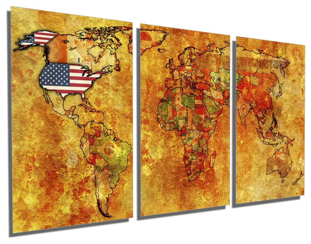 Flag World Map Metal Print Wall Art, 3 Panel Split, Triptych Wall Art, 72x36