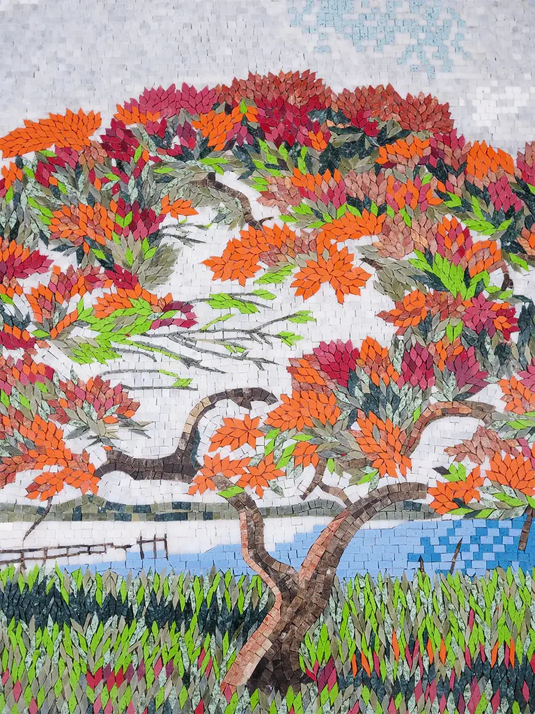A vibrant mosaic artwork that transports you to a tropical paradise where a flamboyant tree bursts with fiery orange blossoms. The artist's skillful use of tesserae captures the intricate details of the tree's canopy, the lush foliage, and the serene waterfront. Palm trees sway gently in the background, adding to the tranquil atmosphere. This mosaic is a celebration of nature's beauty and a reminder of the vibrant colors and textures found in tropical landscapes.