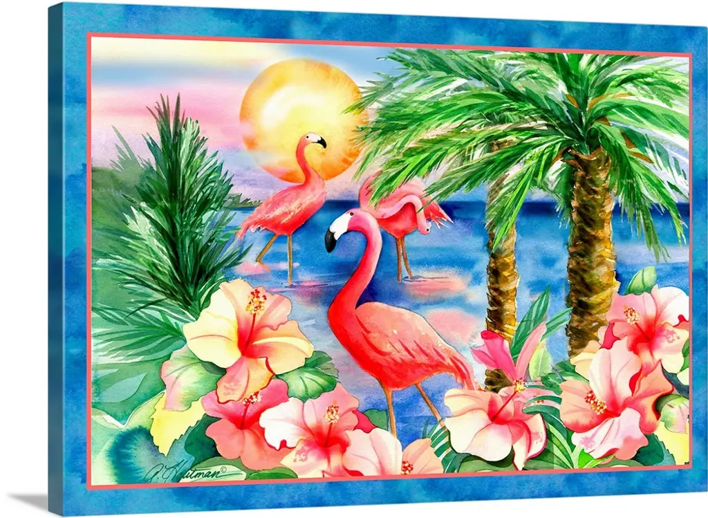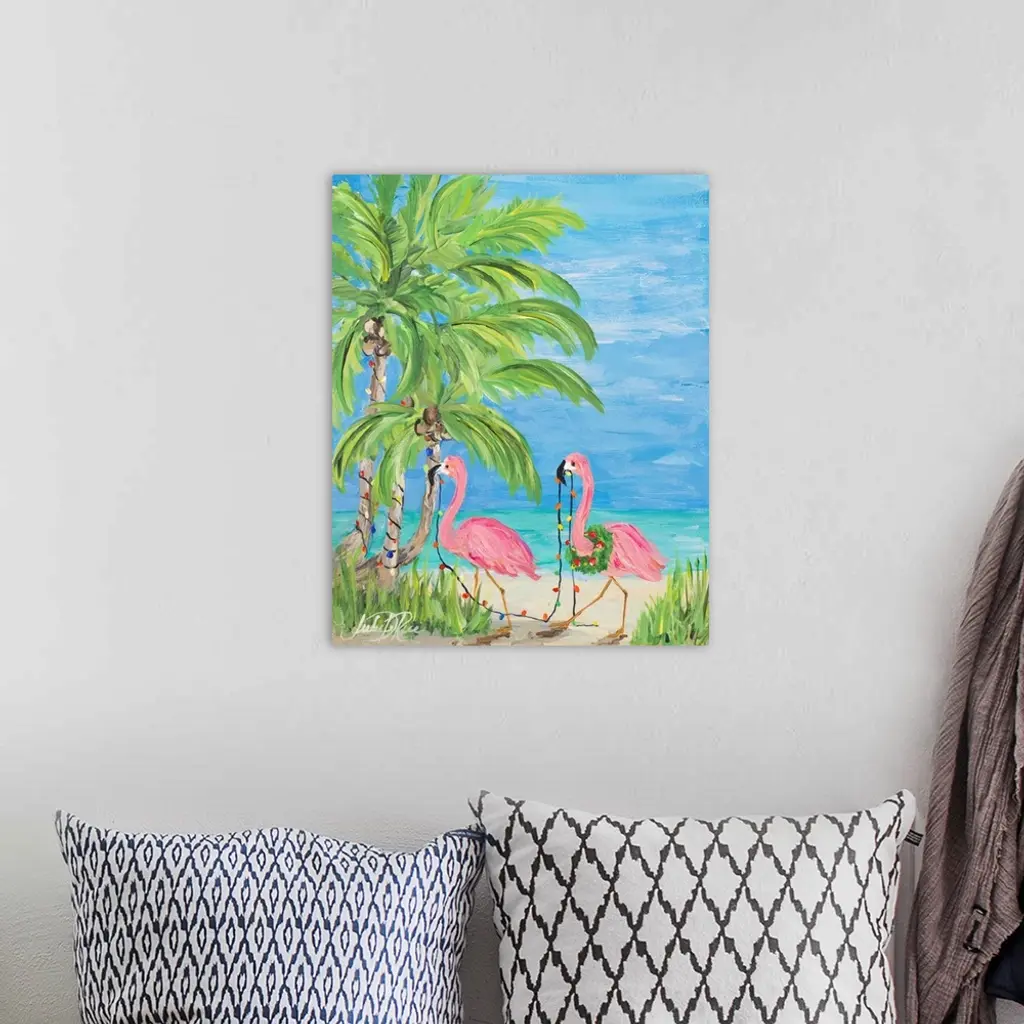Fun tropical Christmas themed painting of two pink flamingos on a beach stringing palm trees with Christmas lights using their beaks.
