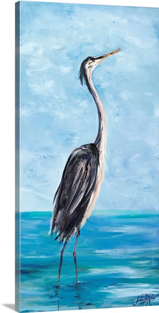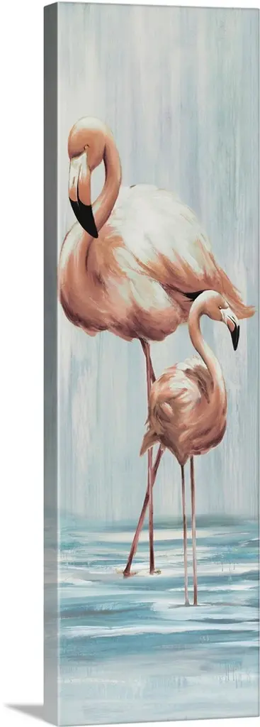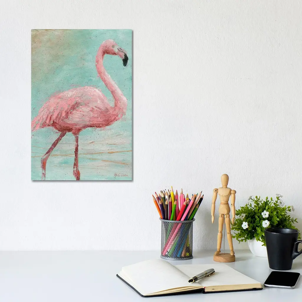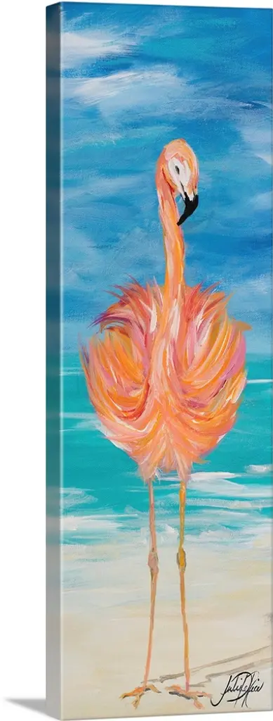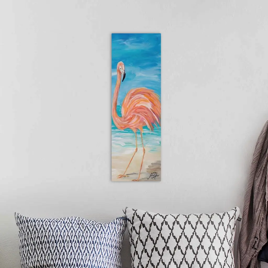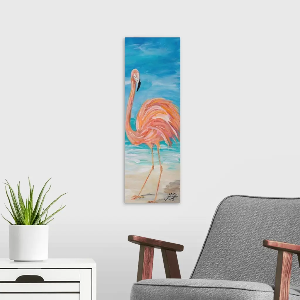 Contemporary painting of a pink flamingo standing on a beach with the ocean in the background.