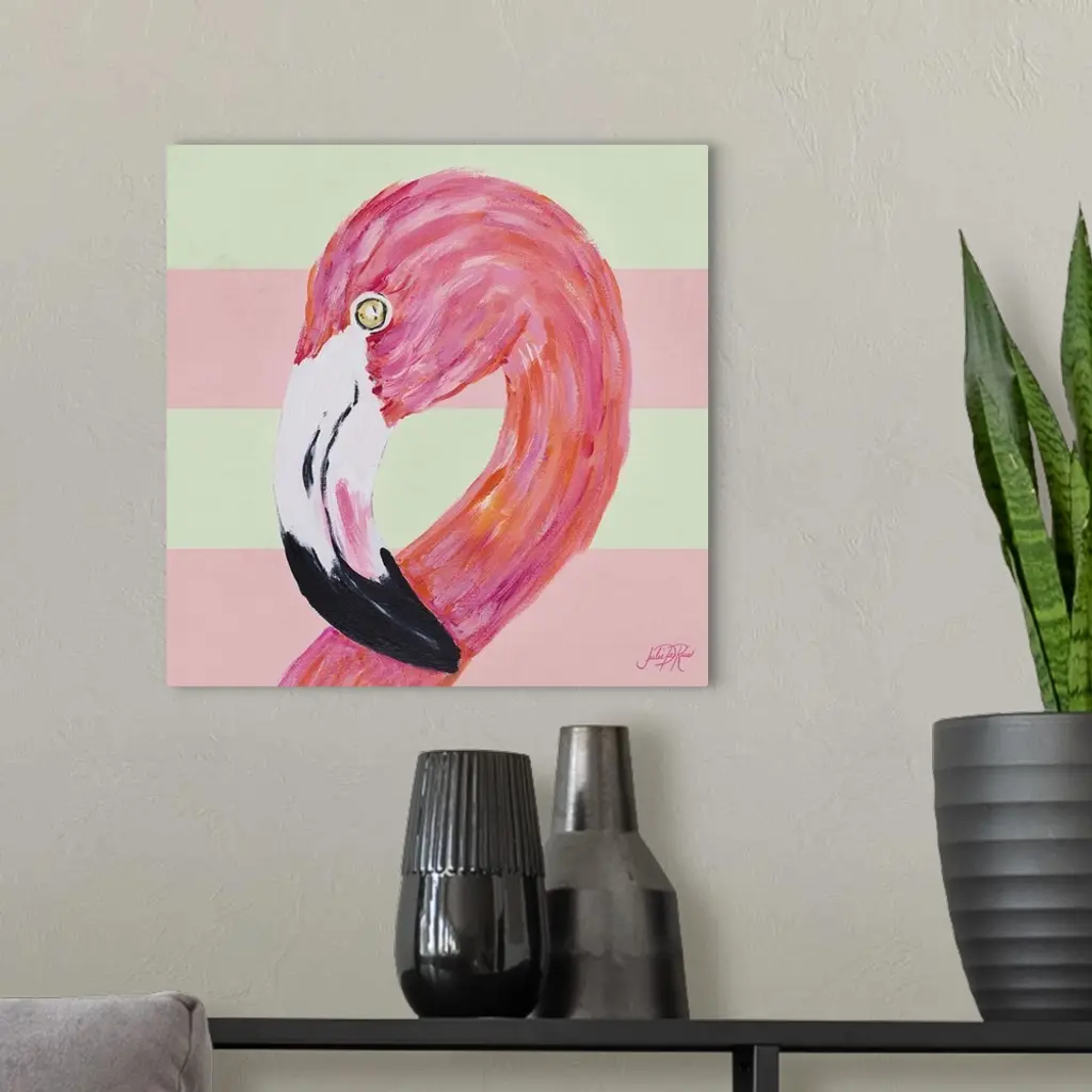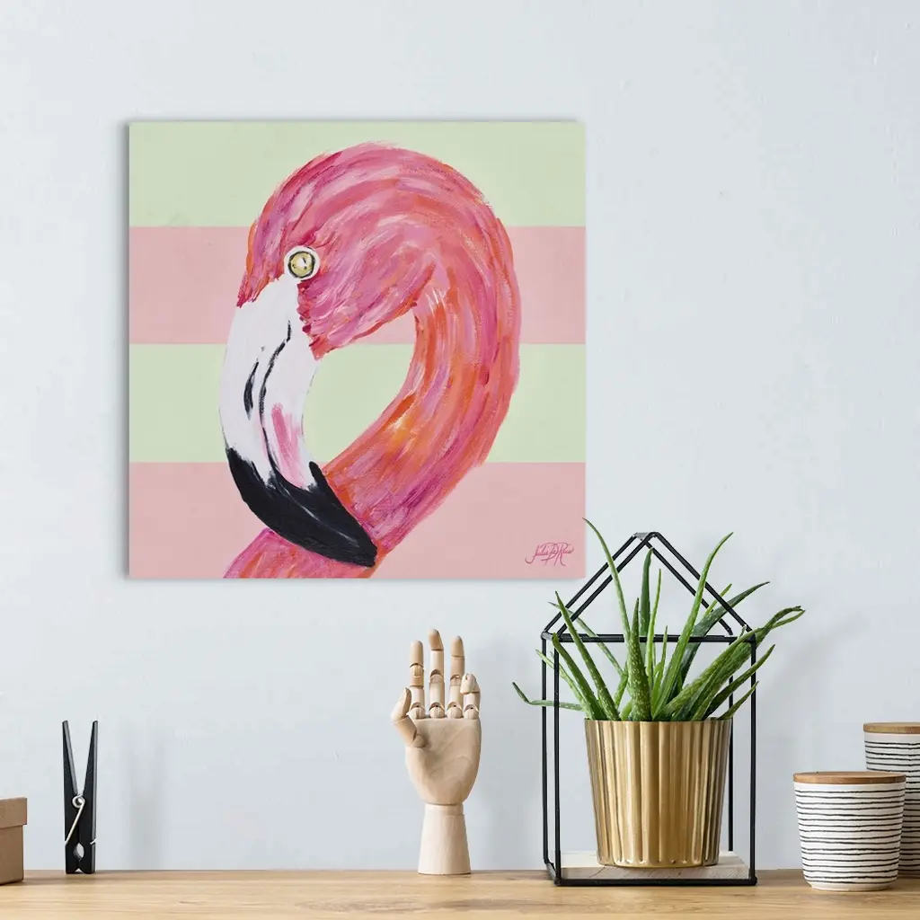 A painting of a pink flamingo with a pale pink and cream striped background.
