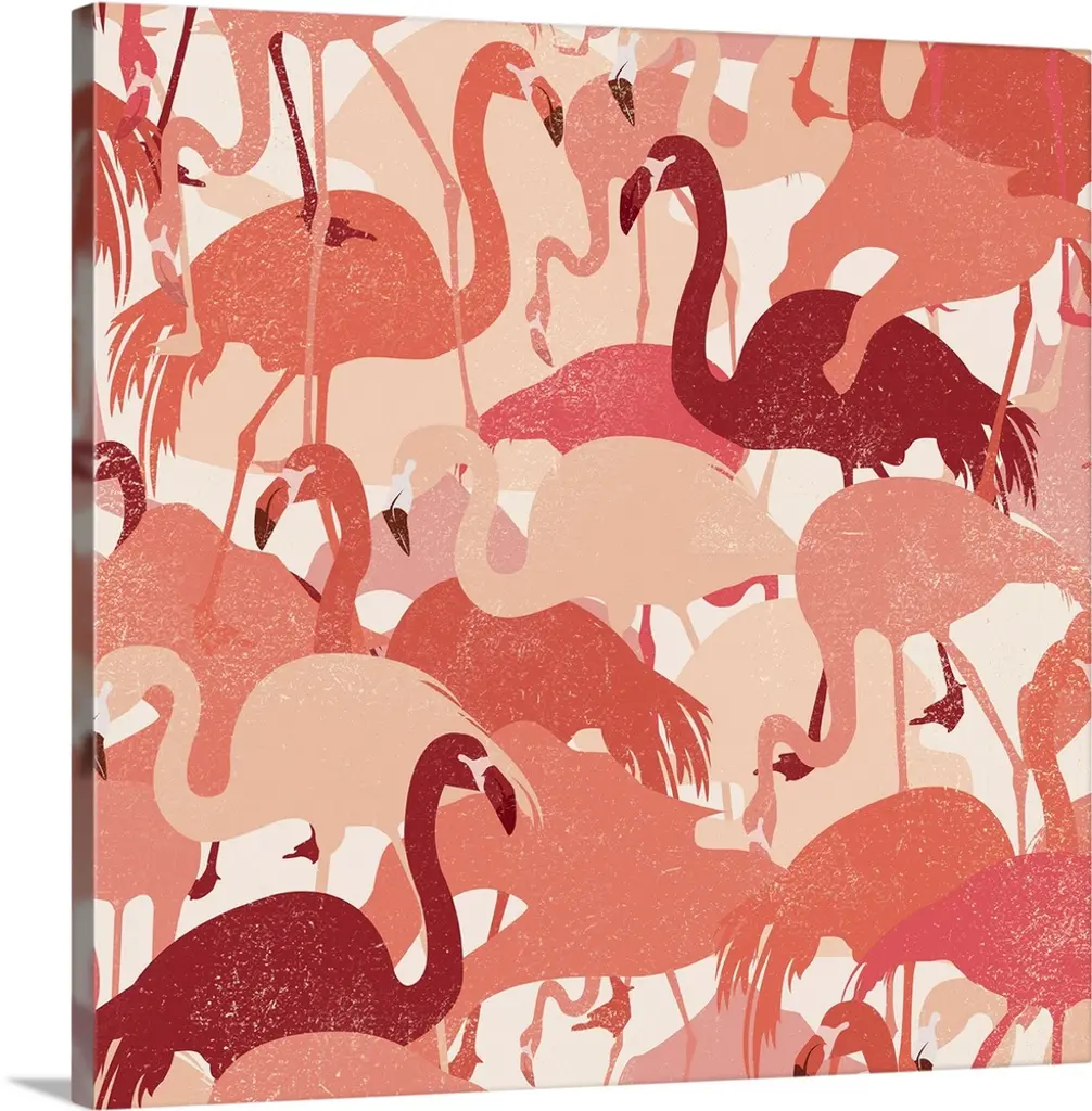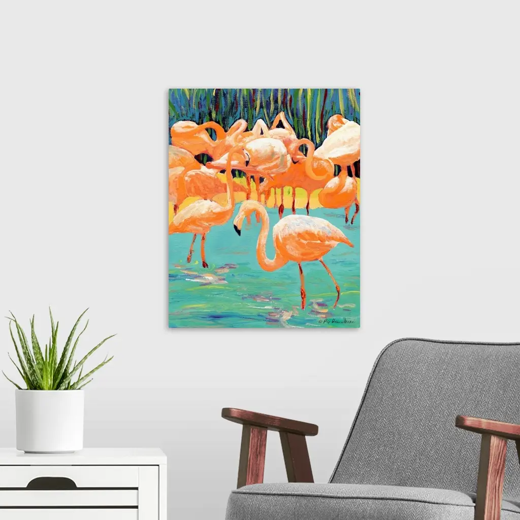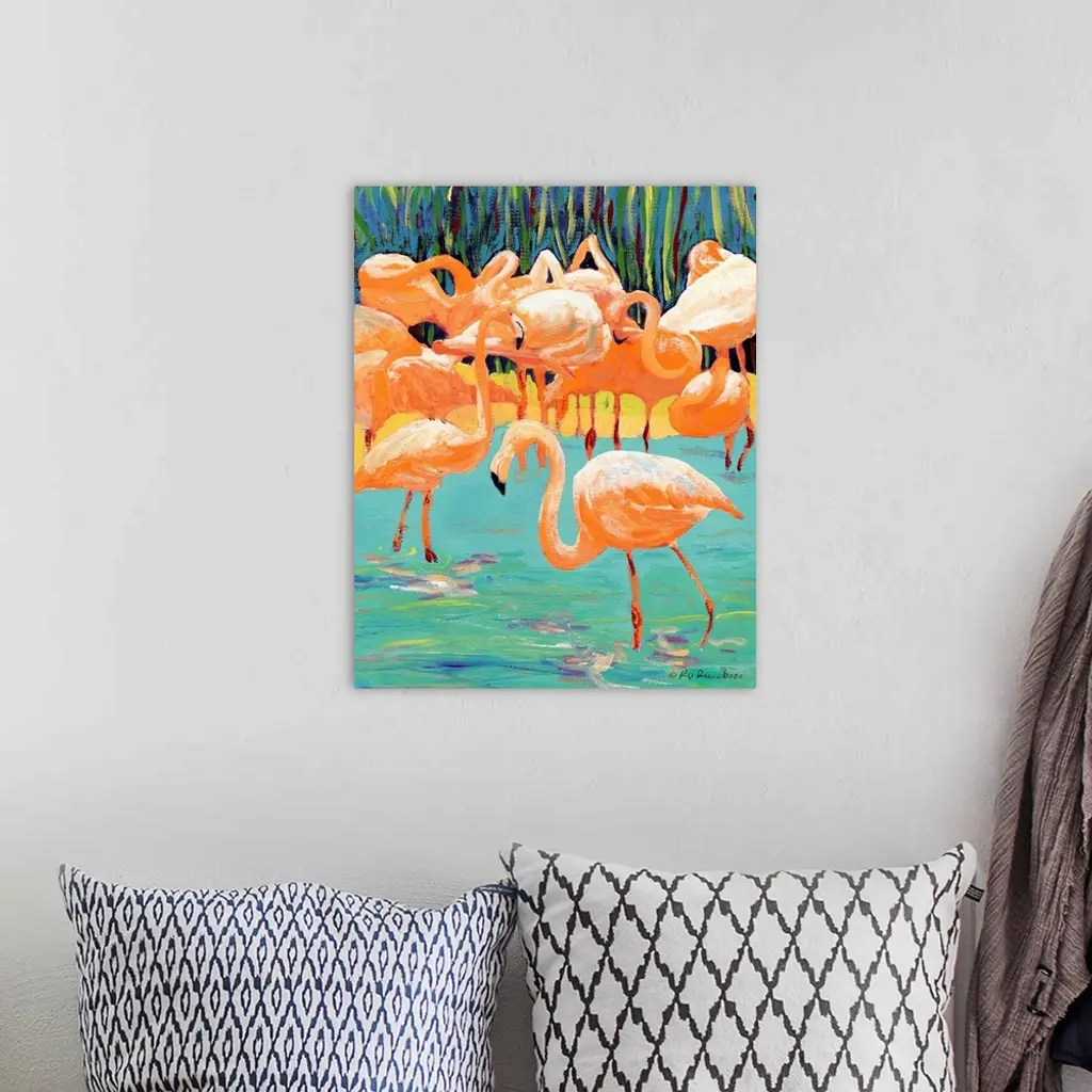 Flamingos by RD Riccoboni Acrylic on canvas bird painting 2009 San Diego CaliforniaAqua, orange, pink, teal, tropical retro