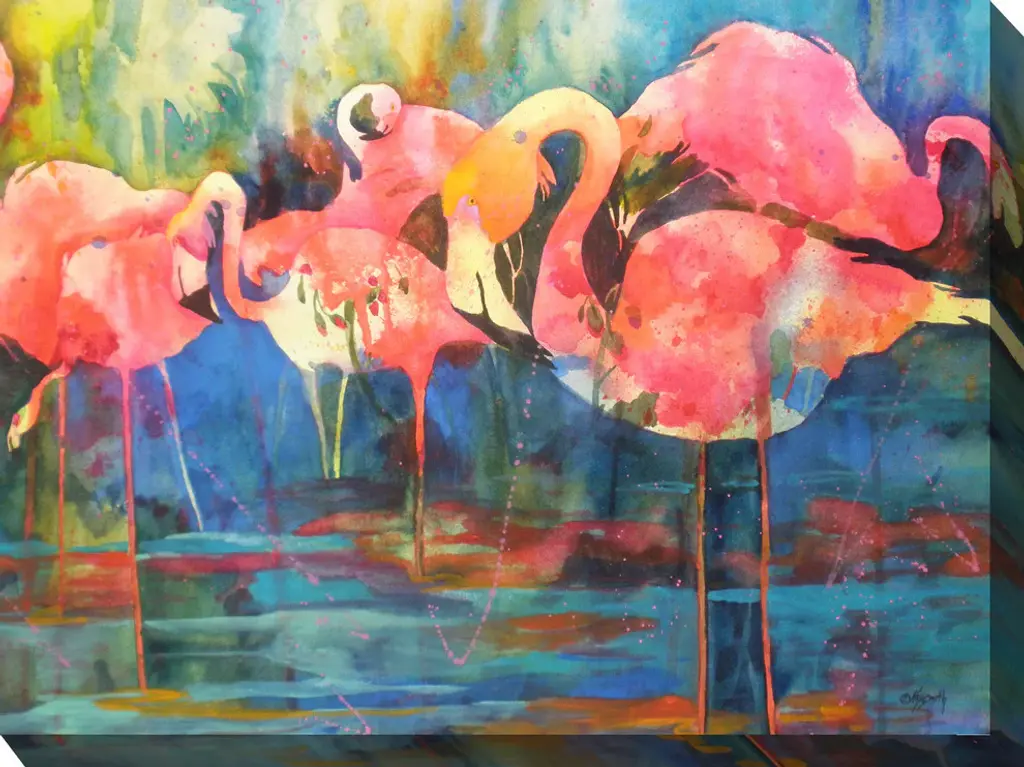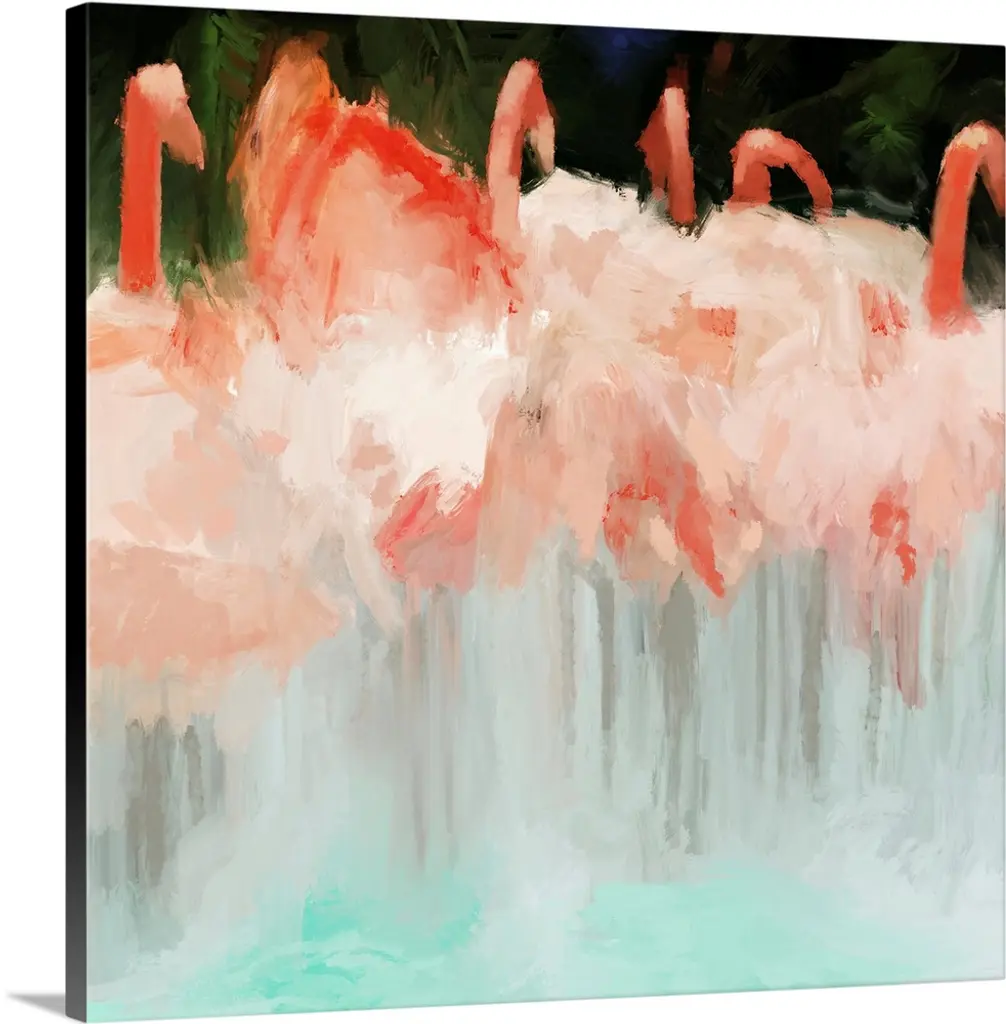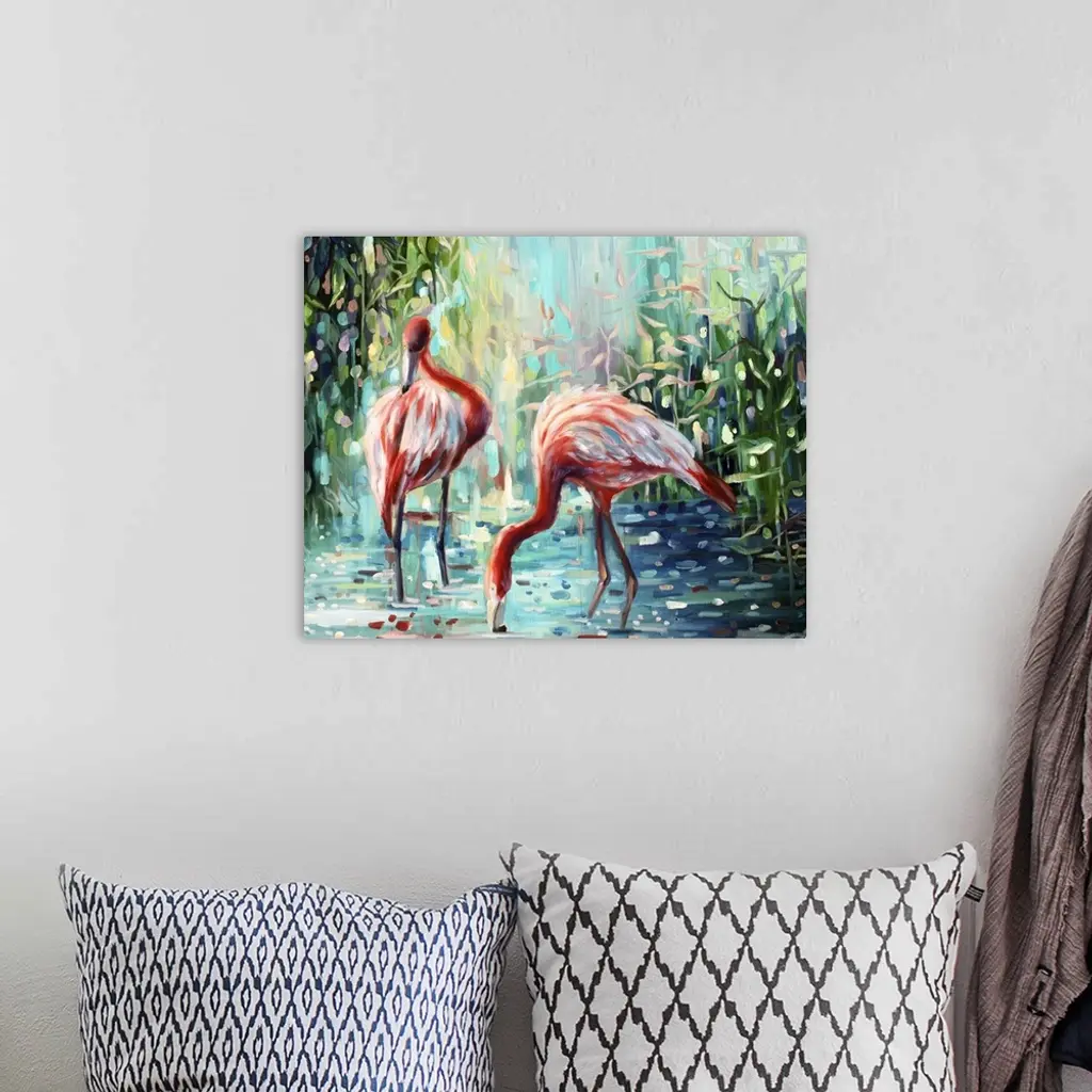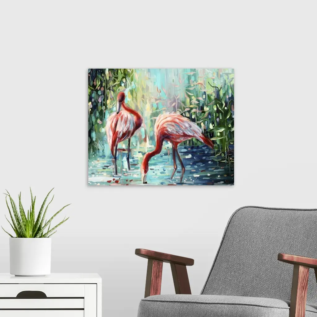 Contemporary painting of flamingos standing in shallow jungle waters.