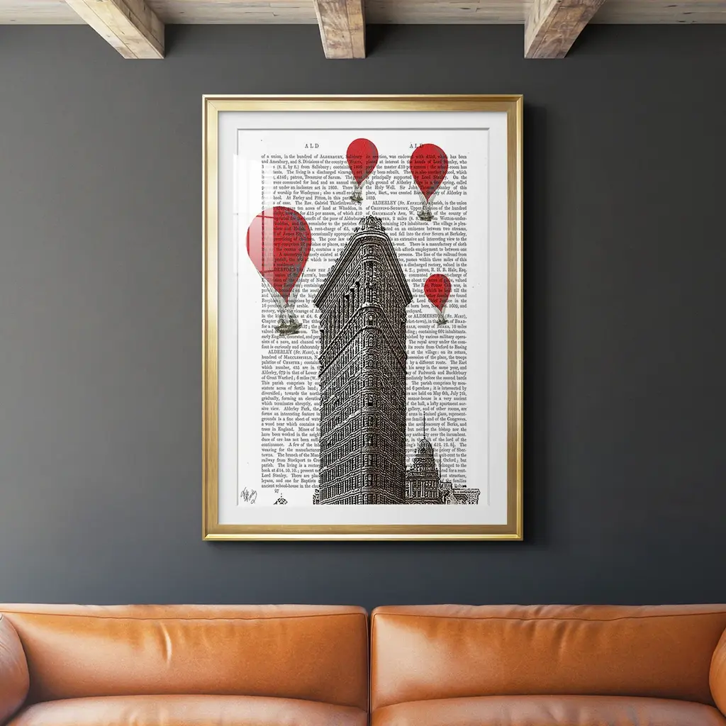 Flat Iron Building and Red Hot Air Balloons Premium Framed Print - Ready to Hang A Premium Framed Print created to last. Framed in distressed wood and available in an array of sizes and colors Featuring a beveled a solid wood stretcher bar, each piece comes ready to hand 4 SIZES AVAILABLE 30.5''X42.5'' - Overall Size 26.5'X36.5'' - Overall Size 22.5''x30.5'' - Overall Size 18.5''x24.5'' - Overall Size Each piece is made to order. Each piece comes with hanging hardware. Made in the USA Ready to Hang Giclee Paper Print Acrylic Glass Beveled Matt Board