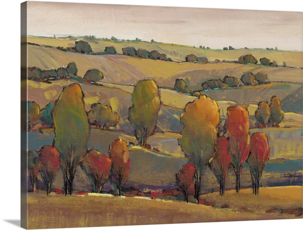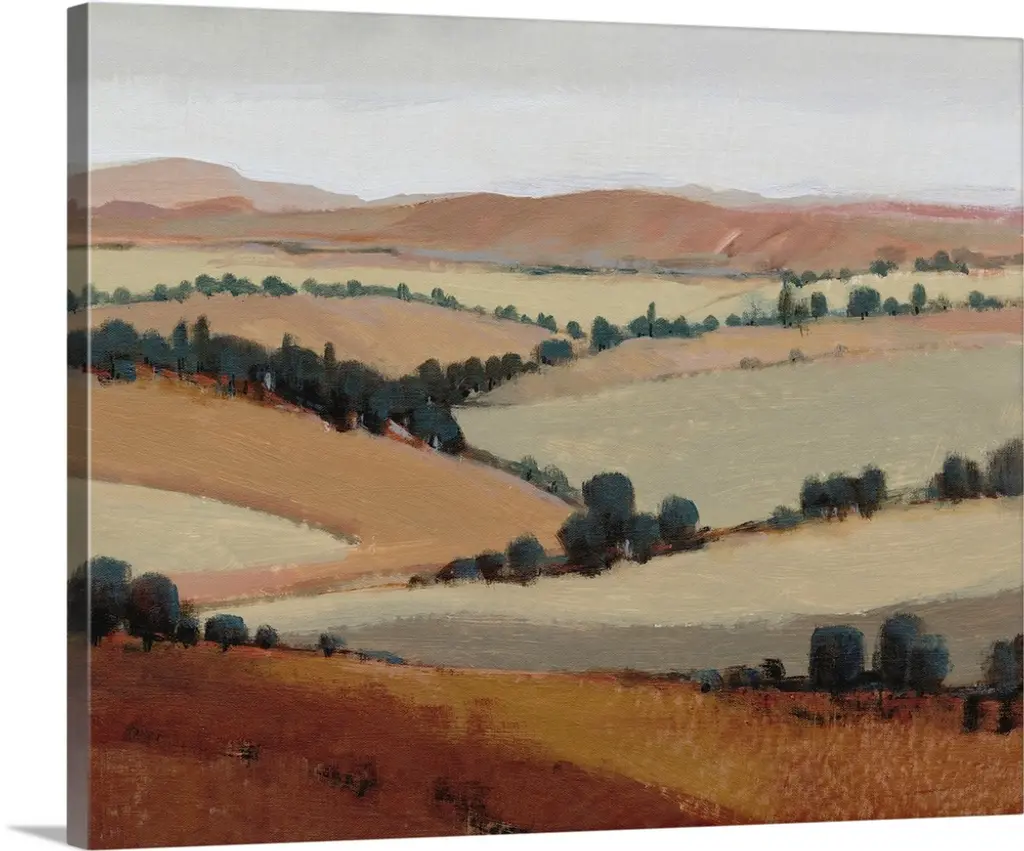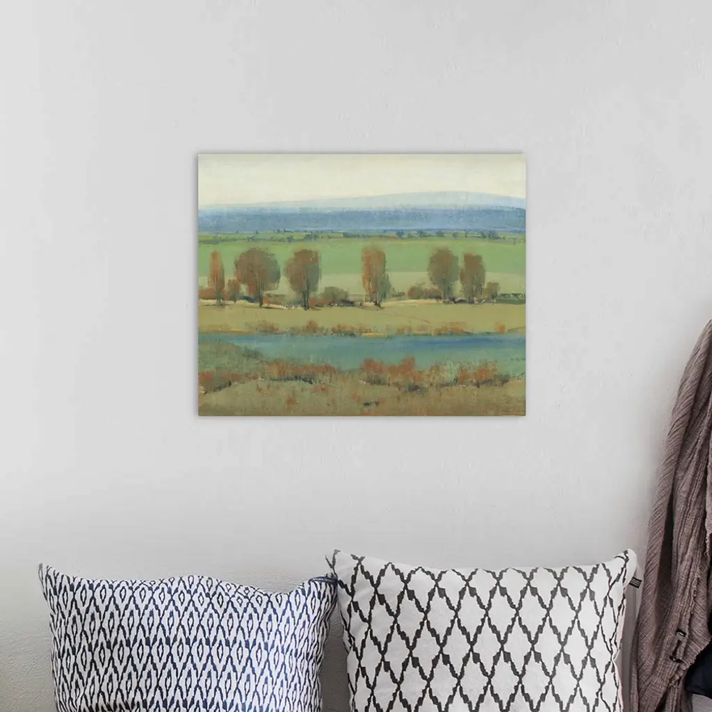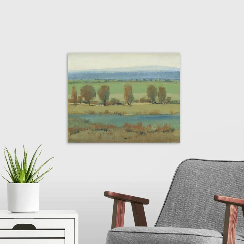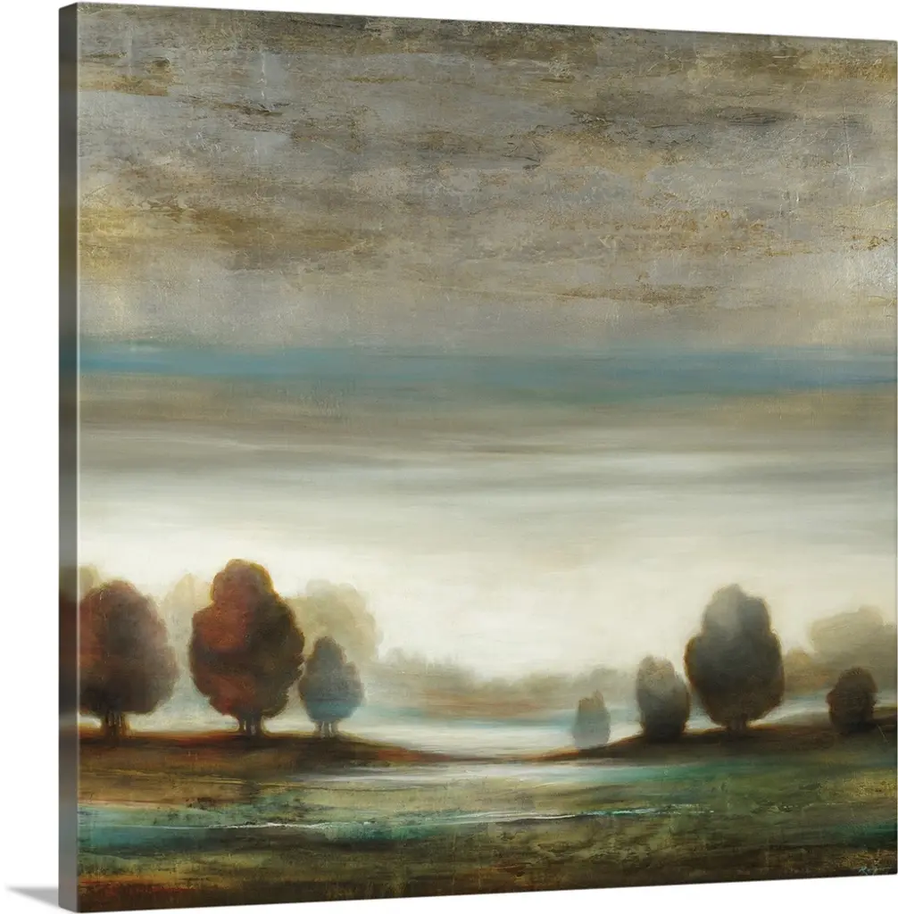 Horizontal brush strokes create this contemporary artwork of a relaxing countryside.