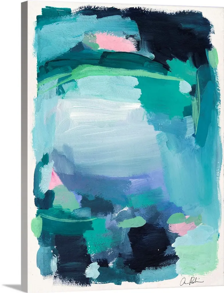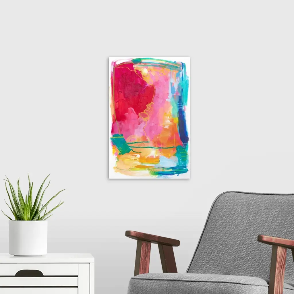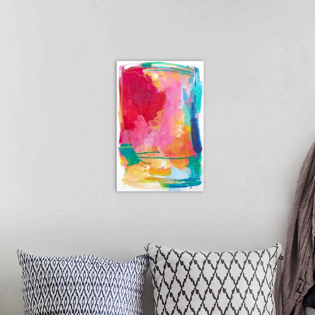 Contemporary abstract artwork in bright red, pink, and teal shades.
