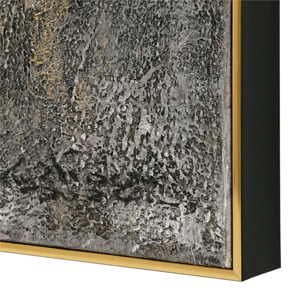 Flickering Embers is a contemplative piece that fosters a refined, sophisticated atmosphere in any space. This oil painting on canvas showcases a misty gray backdrop overlain by subtle gold tones, as if a once raging flame has been reduced to subtly burning embers. This beautiful artwork is held within a gold aluminum gallery frame.