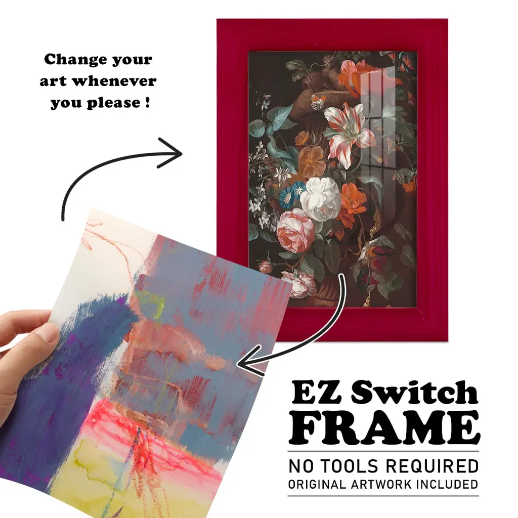 Flim Flam II -EZ SWITCH Framed Print w/glass-Cherry Red A delightful, framed print. Featuring a solid wood frame with real wood glass. This premium print is giclee quality. In addition, every frame features a removable back and table top stand. This allows you to change your art in the future or to just stand the art on a table for a new look. We are sure you'll enjoy our new series of EZ SWITCH Framed Art. Solid Wood Frame Real Glass Removable / Replaceable Art Built in Tabletop Stand Sizes range from 4x6 up to 12x15 - buy just one or pair them up as sets as you see fit.