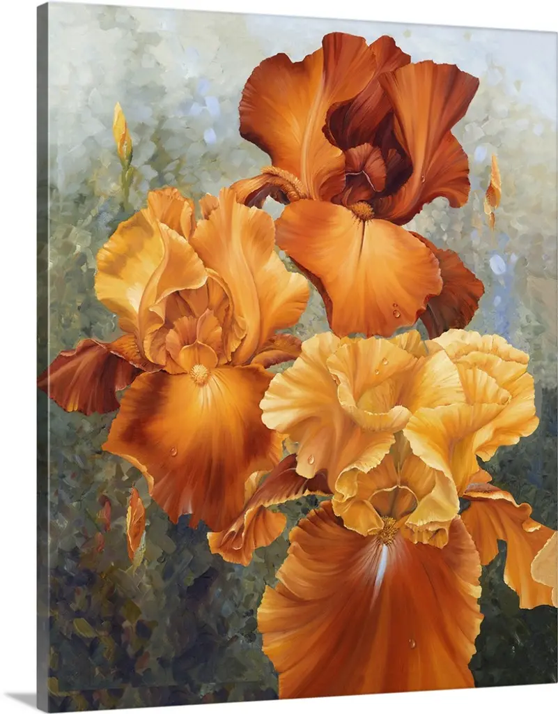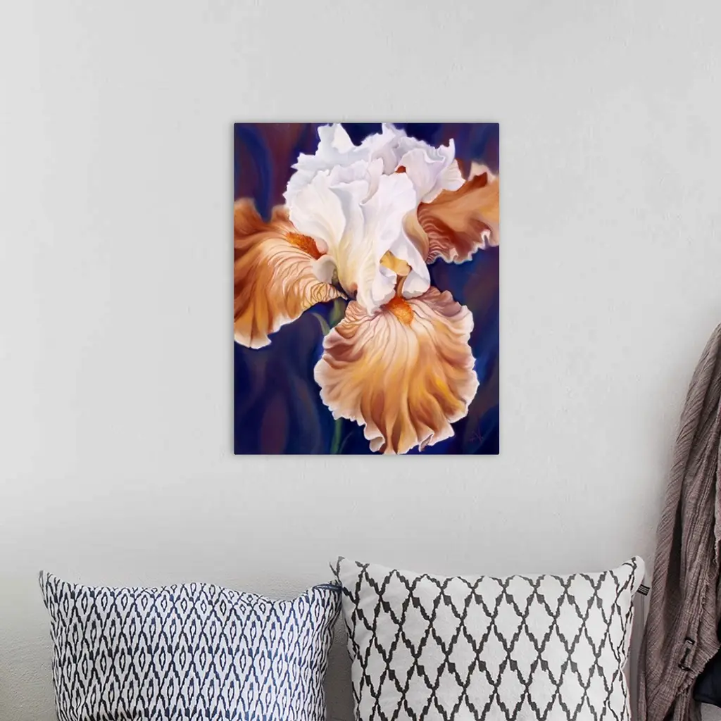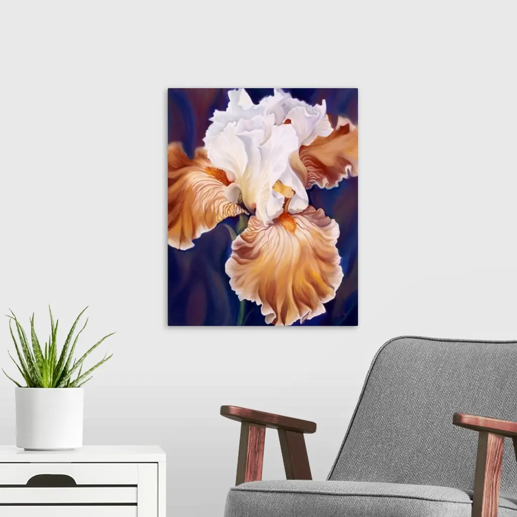 Flirtation is a big flower painting of a bearded iris with white top petals and amber, burnt orange bottom petals sitting on a deep navy-blue background. It brings a relaxing and uplifting mood to a room.
