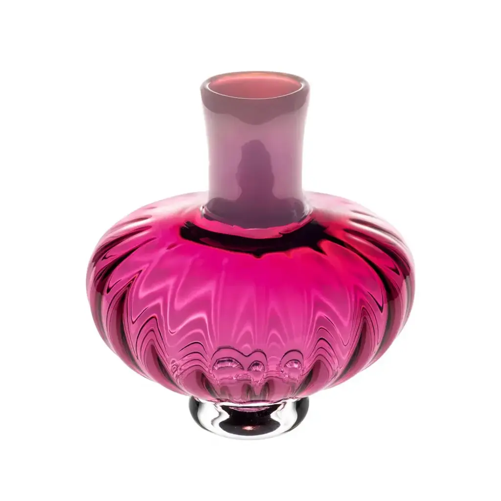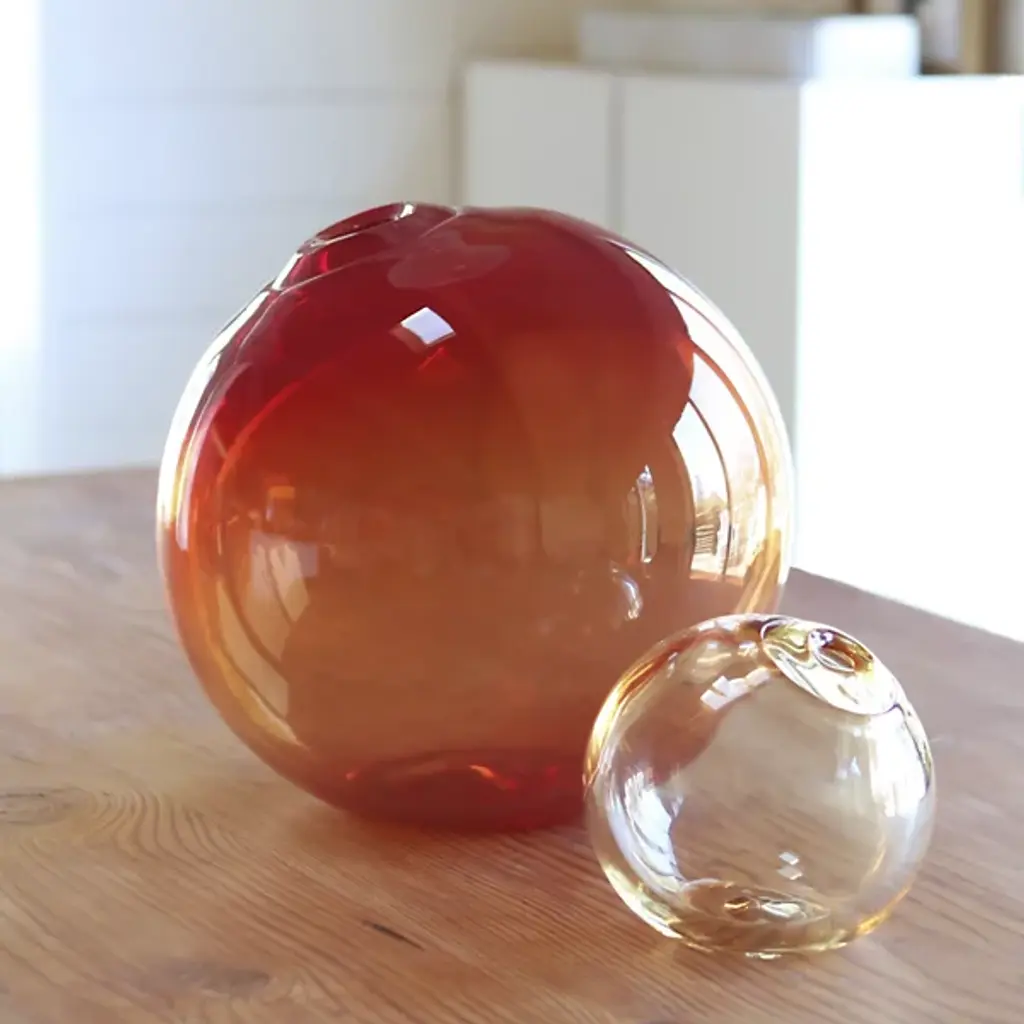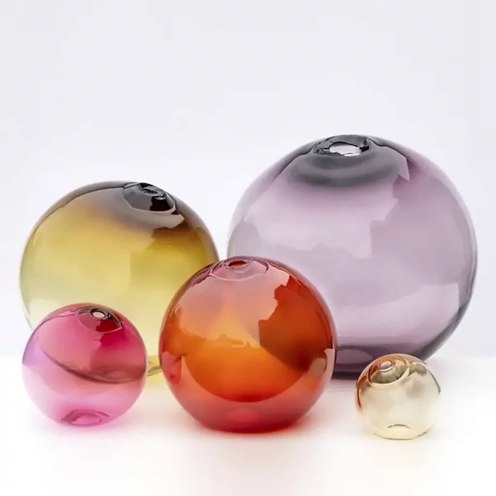 SkLO's Float Vessel series is designed to be a custom art piece, with mixed colors and sizes. Whether a small vignette or a large installation, these pieces create a relationship to one another and glow in any space they inhabit. Double-dipped into molten glass to create a slight ripple near the top, the Float Vessel is then broken off the pipe and torch-polished to create the opening. Each Float Vessel is a unique, one-of-a-kind piece.