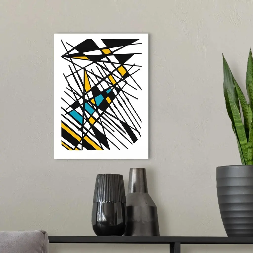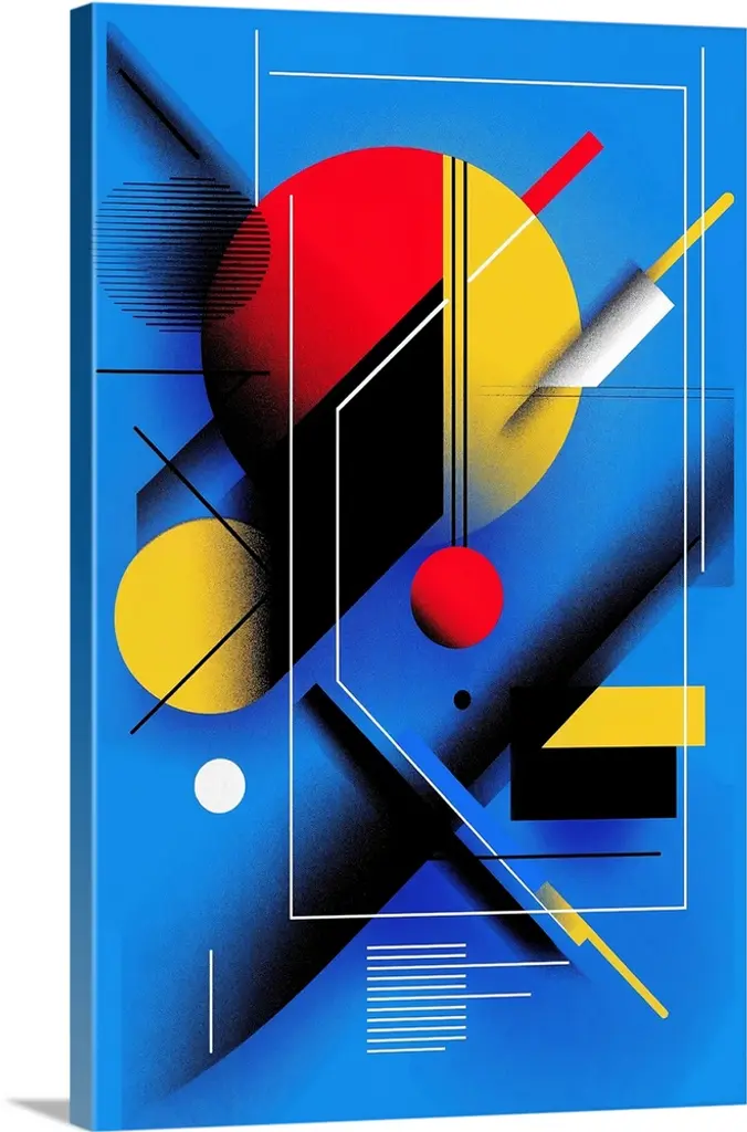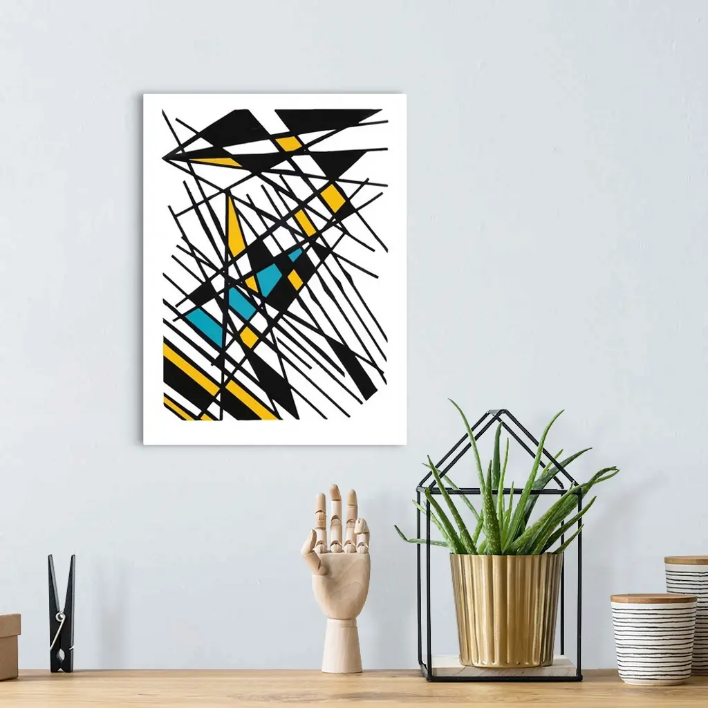 Abstract expression painting in which geometric color and lines invade the space in contrast with different elements: light, shadows, shape, texture and movement.
