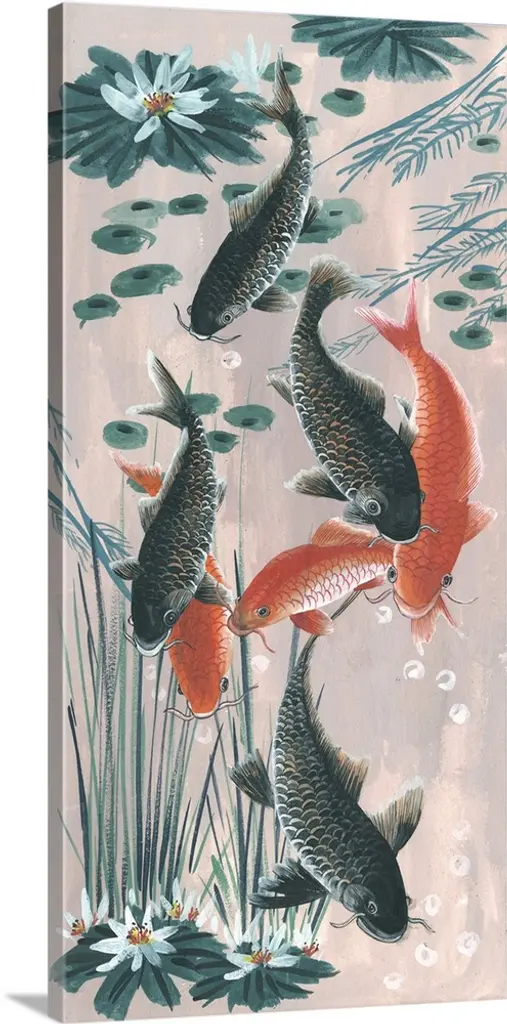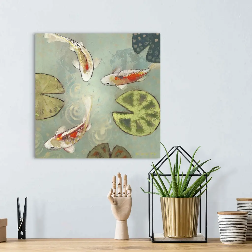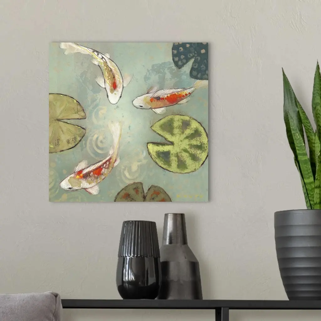 Contemporary painting of white and orange koi swimming amid lily pads in a shallow pond.