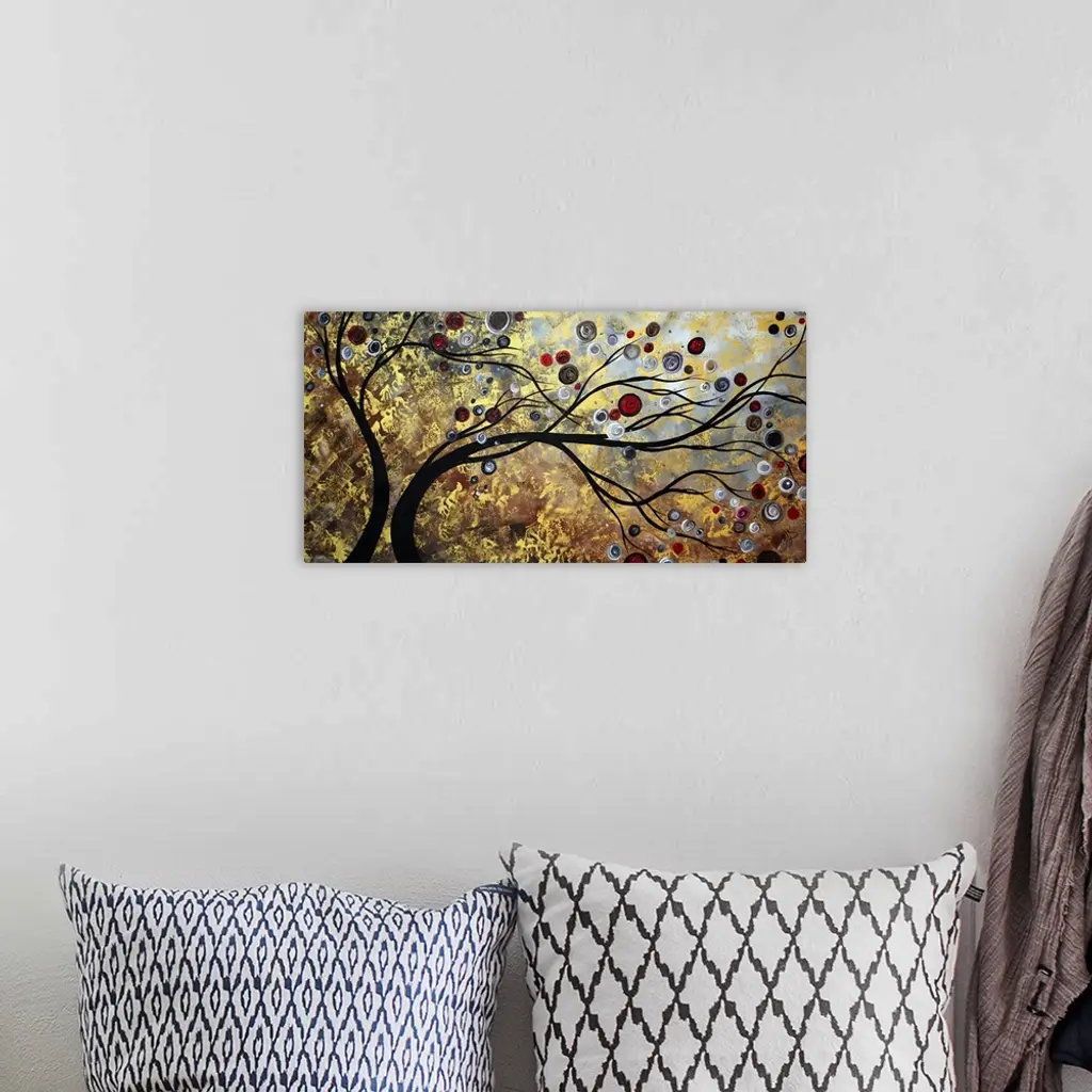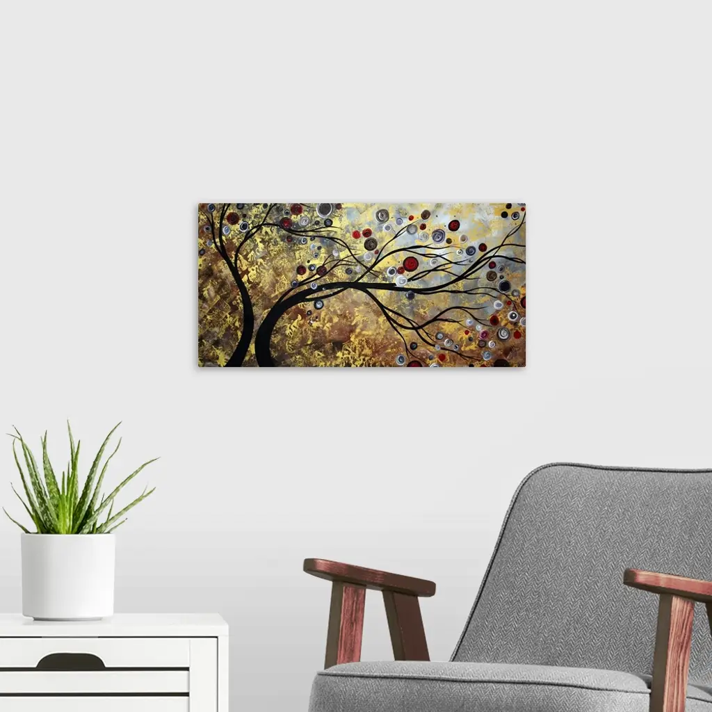 Abstract artwork featuring two trees swaying surrounded by ciruclar and other ornate designs. Mixture of vibrant and neutral tones.