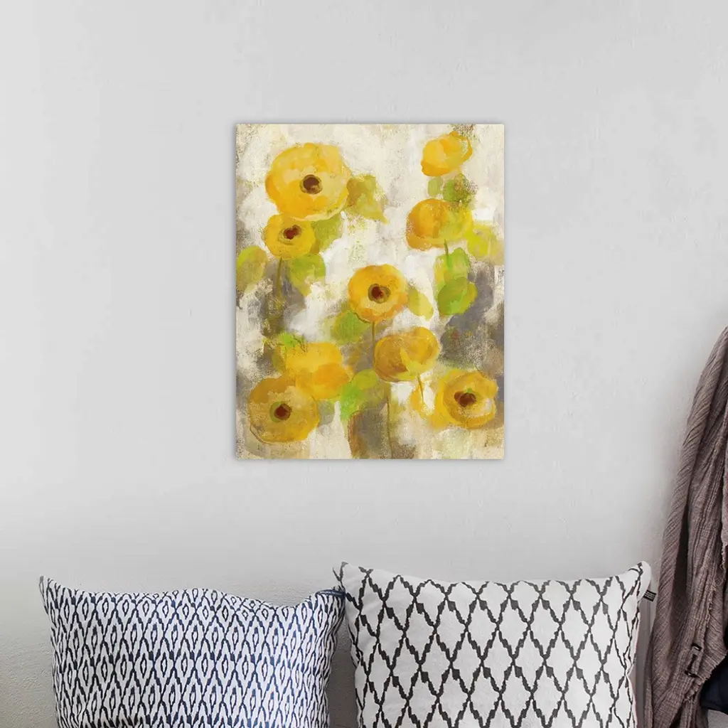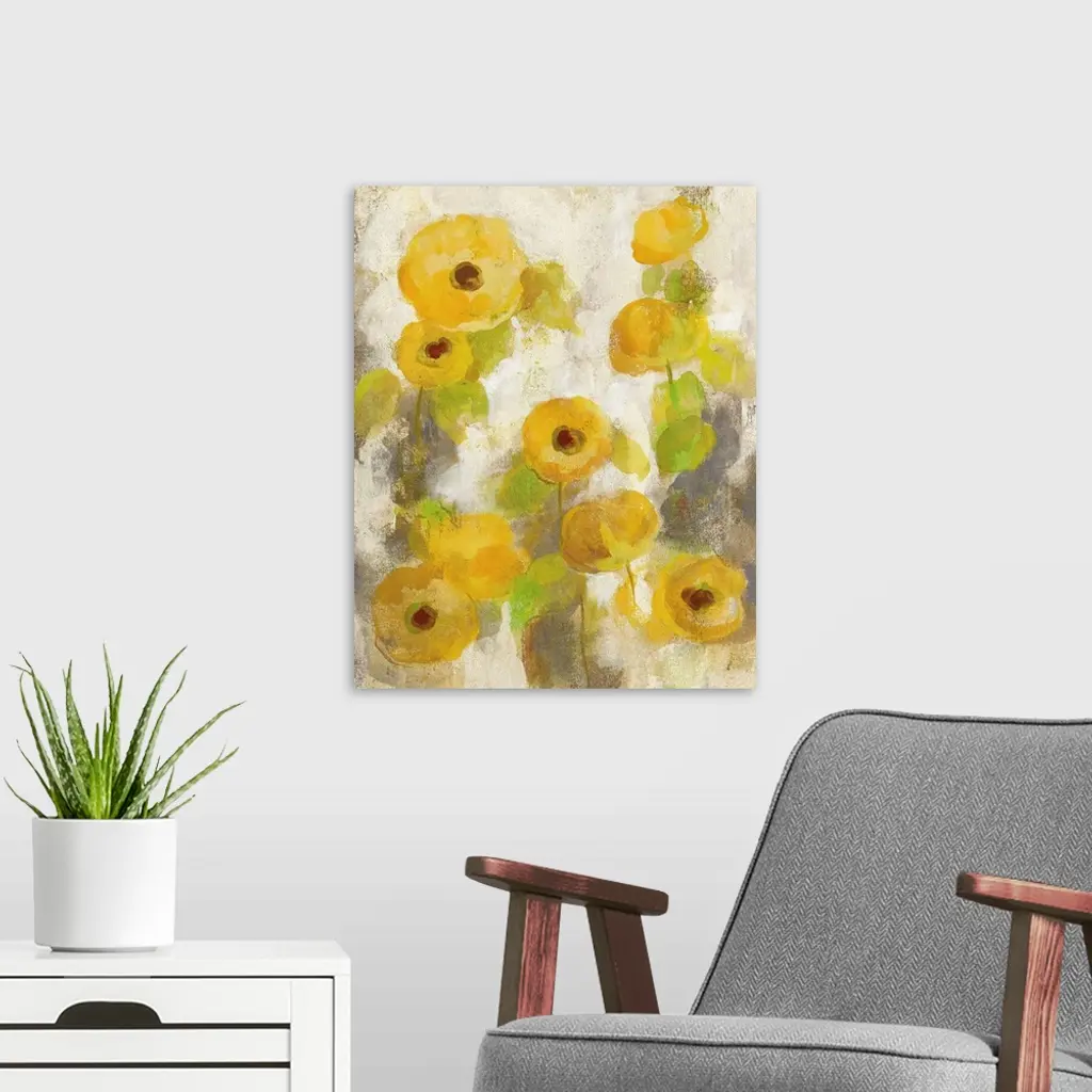 Contemporary painting of flowers in a muted yellow against a beige background.