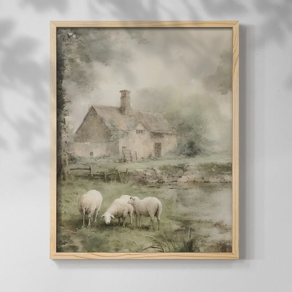 Flock Of Sheep Landscape Print On Canvas In Thin Gold Frame- A 20" X 30" Print, Framed To 22" X 32"