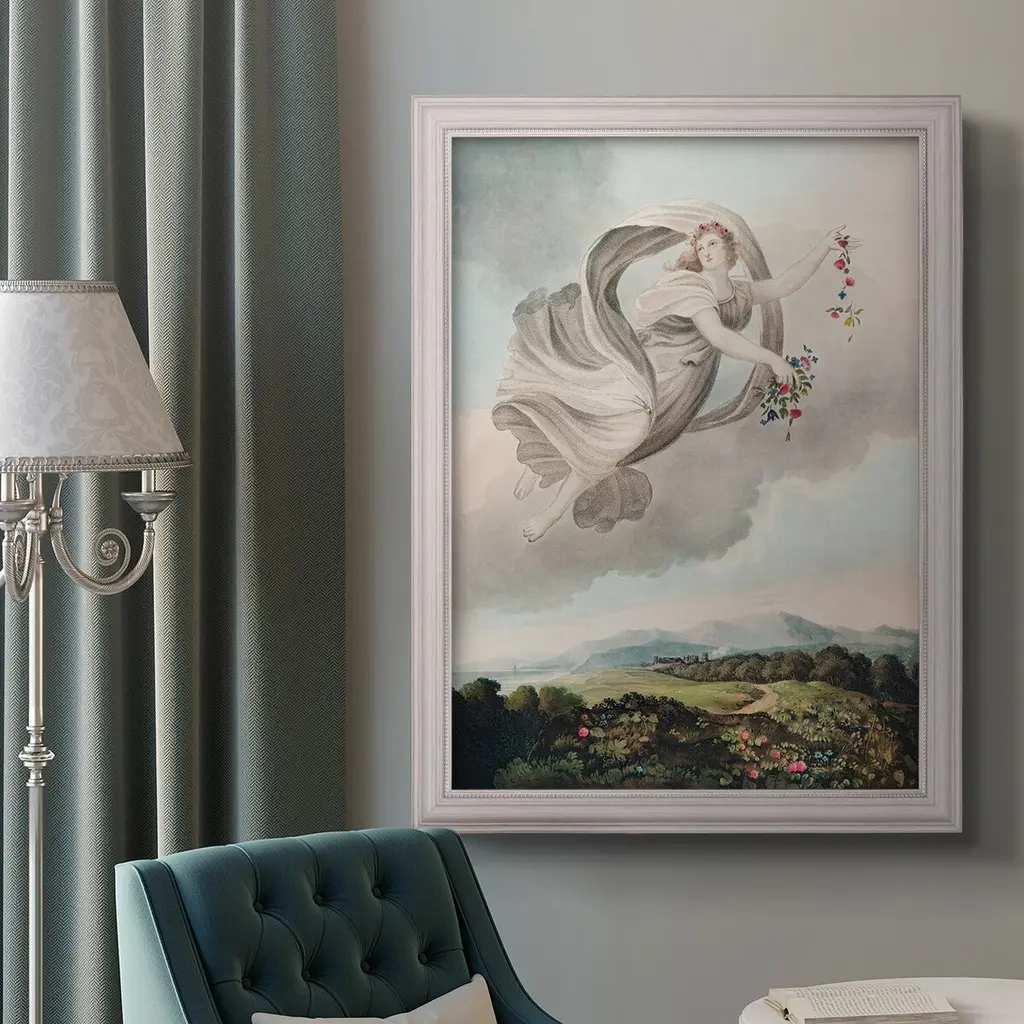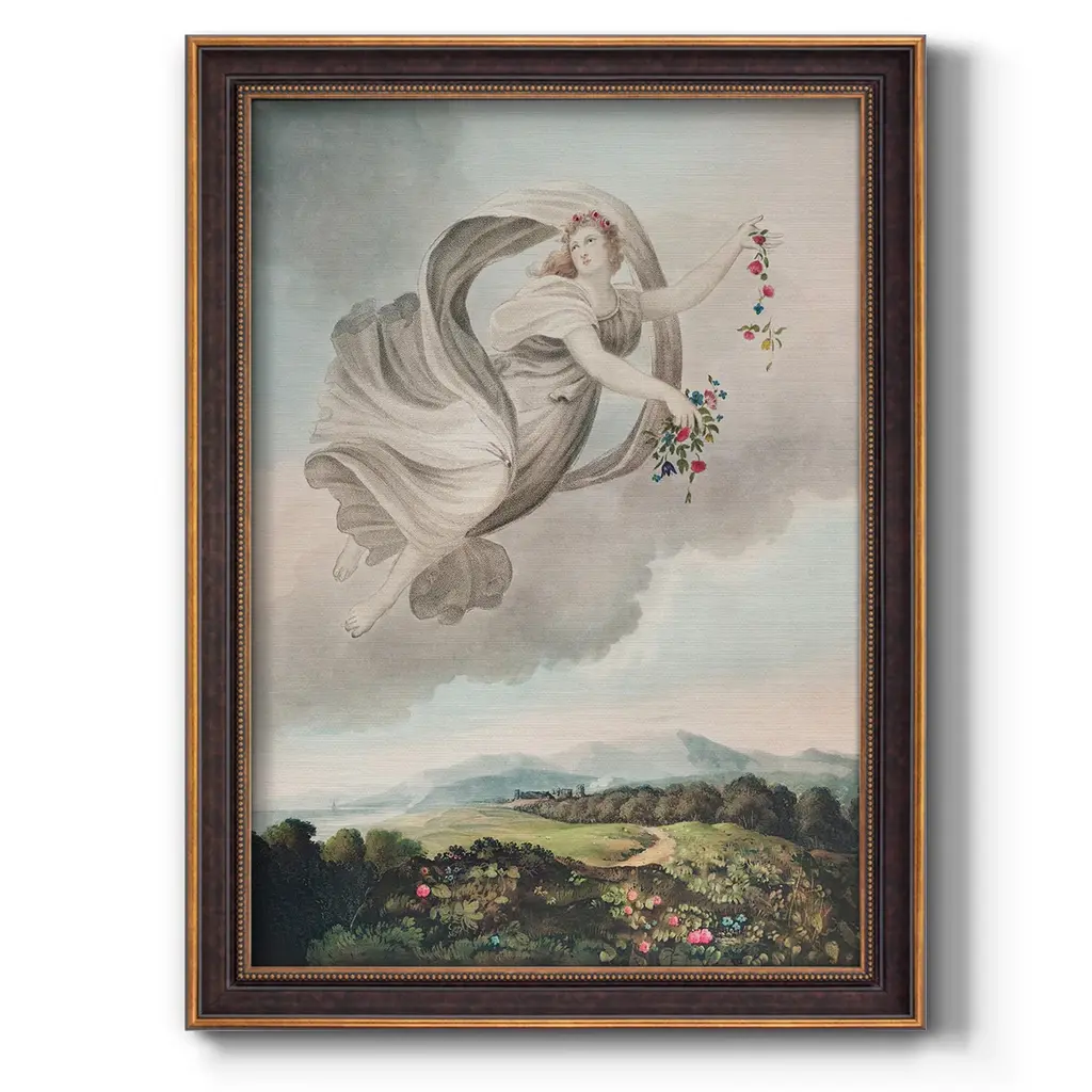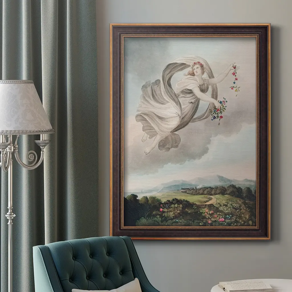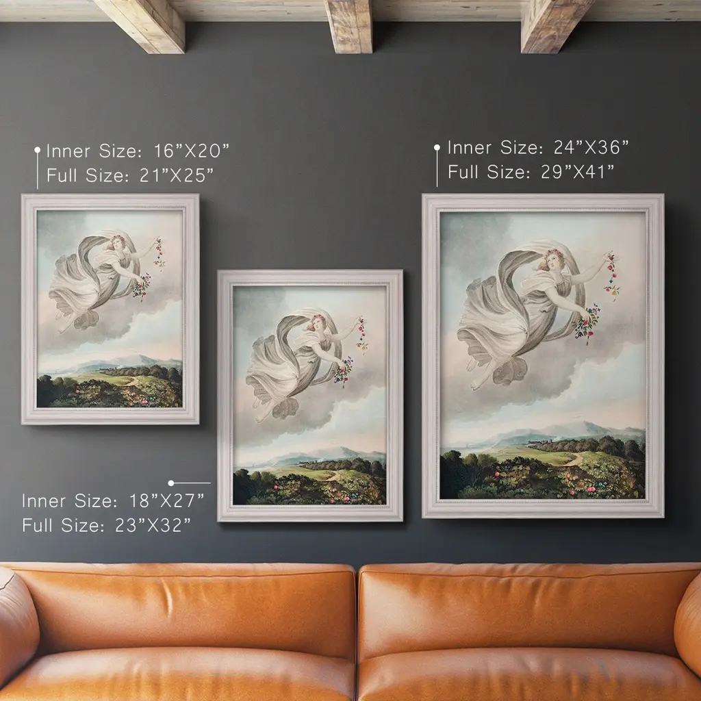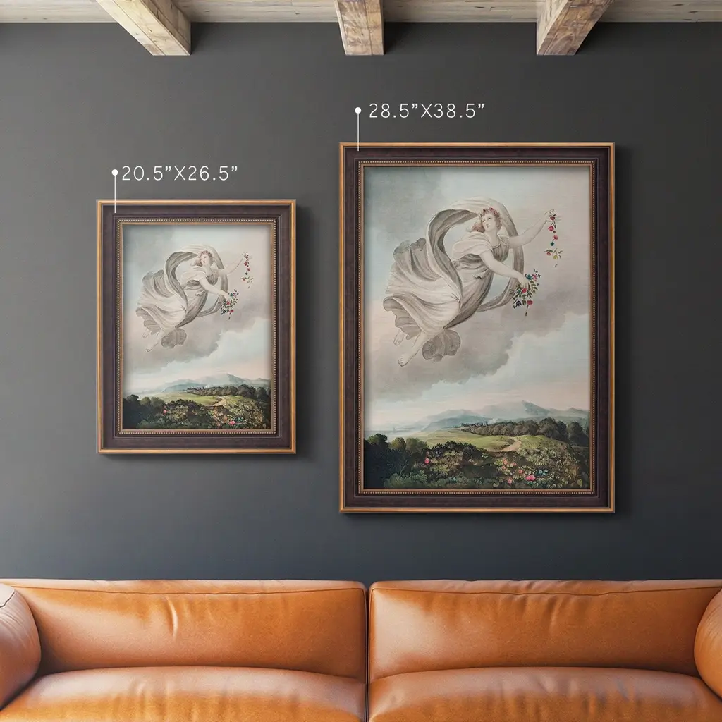 flora dispensing her favours Premium Framed Canvas- Ready to Hang A Premium Framed Canvas created to last. Framed in distressed wood and available in an array of sizes and colors Featuring a beveled a solid wood stretcher bar, each piece comes ready to hand 3 SIZES AVAILABLE 16''X20'' - Overall Size 18'X27'' - Overall Size 24''x36'' - Overall Size Each piece is made to order. Each piece comes with hanging hardware. Made in the USA Ready to Hang Giclee Paper Print Acrylic Glass Beveled Matt Board