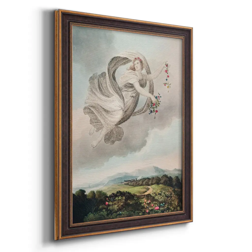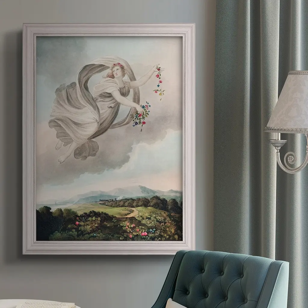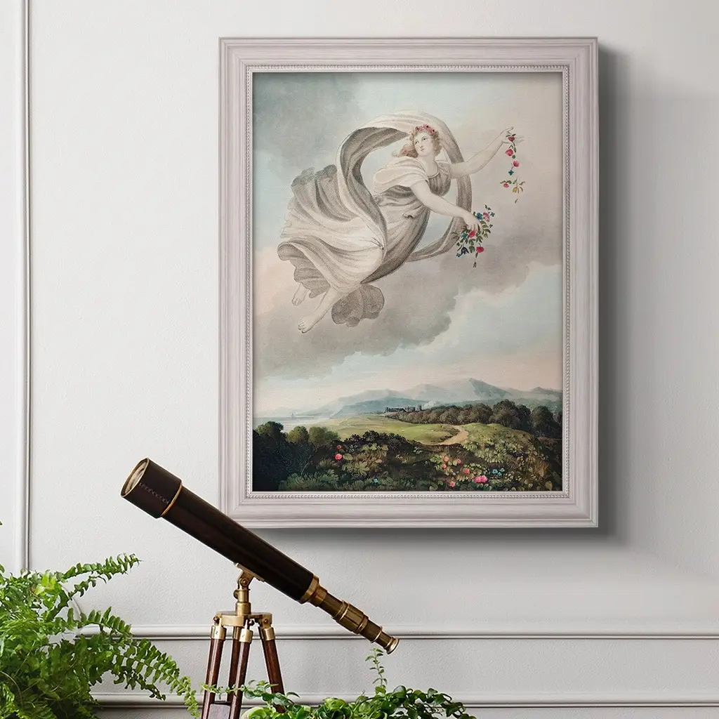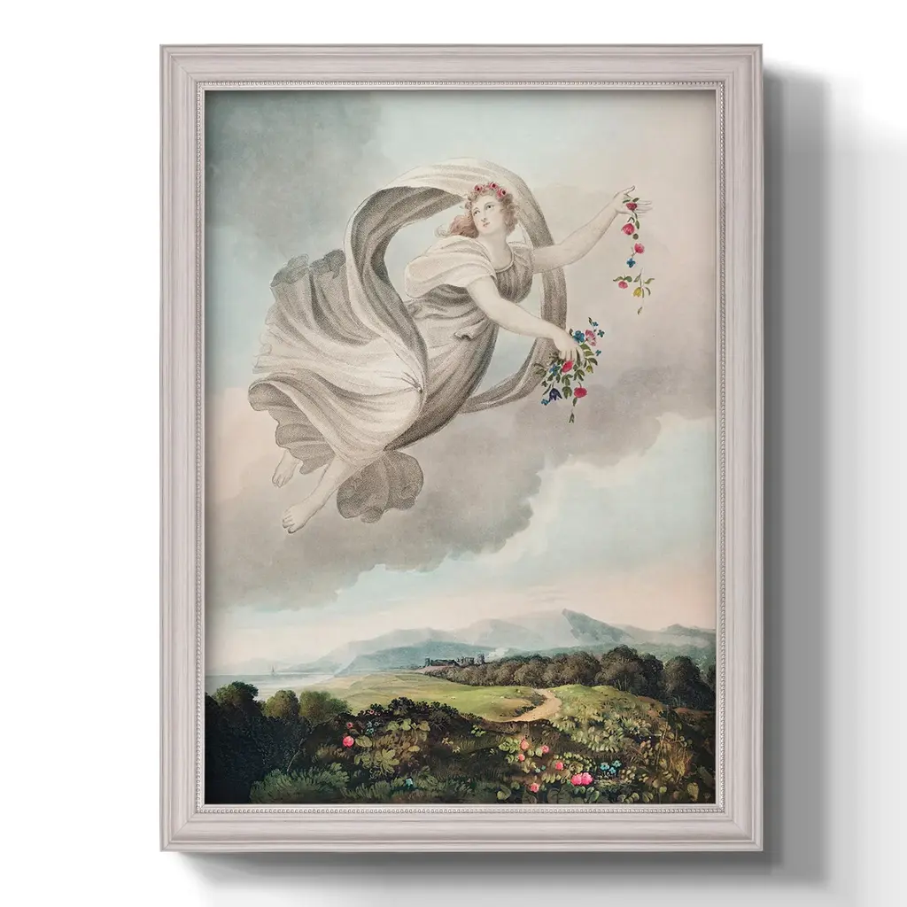 flora dispensing her favours Premium Framed Canvas- Ready to Hang A Premium Framed Canvas created to last. Framed in distressed wood and available in an array of sizes and colors Featuring a beveled a solid wood stretcher bar, each piece comes ready to hand 3 SIZES AVAILABLE 16''X20'' - Overall Size 18'X27'' - Overall Size 24''x36'' - Overall Size Each piece is made to order. Each piece comes with hanging hardware. Made in the USA Ready to Hang Giclee Paper Print Acrylic Glass Beveled Matt Board