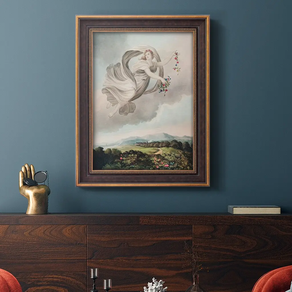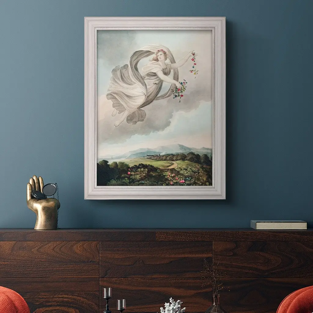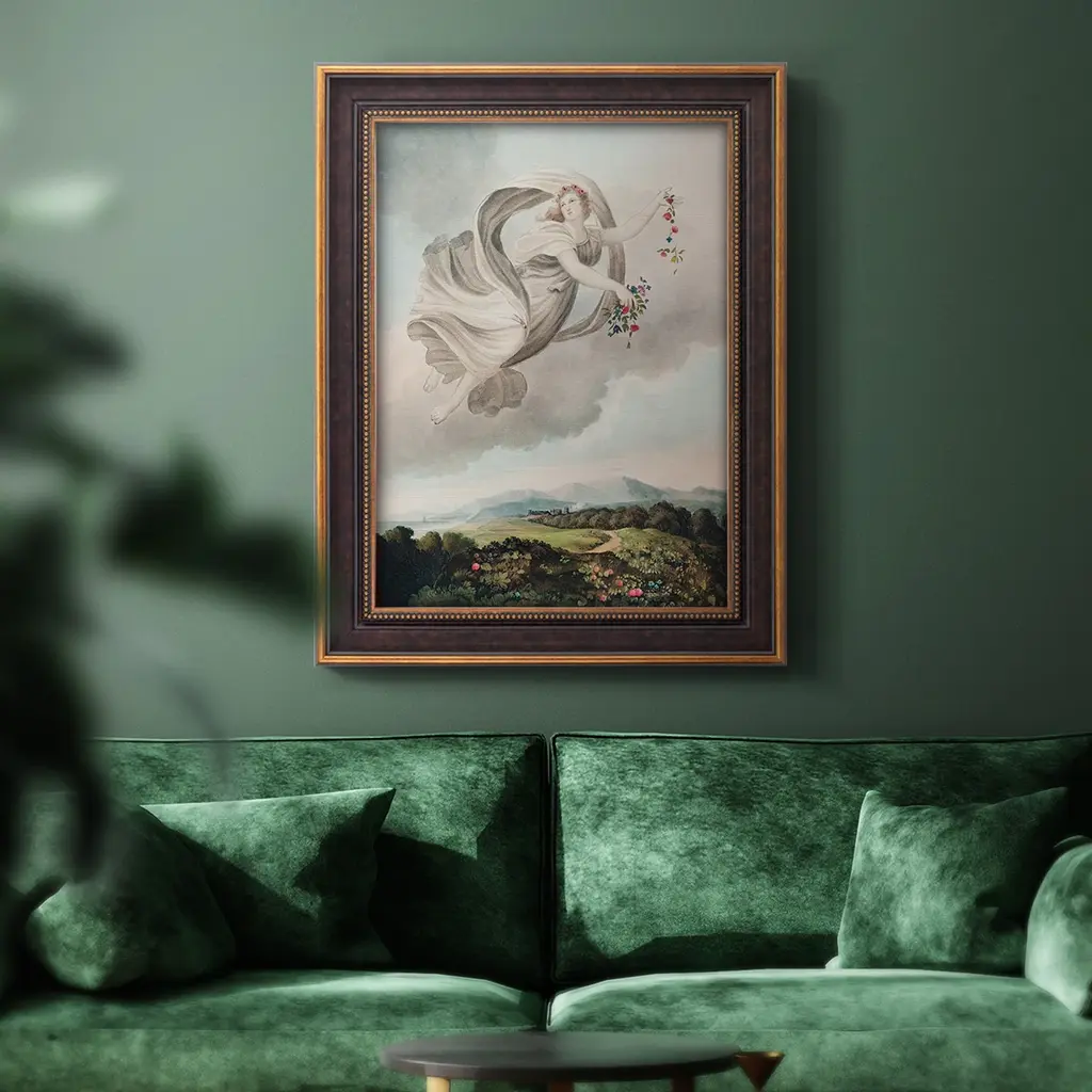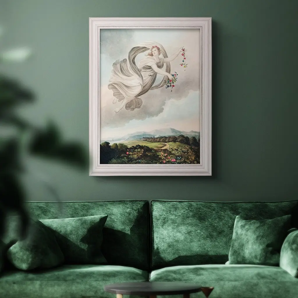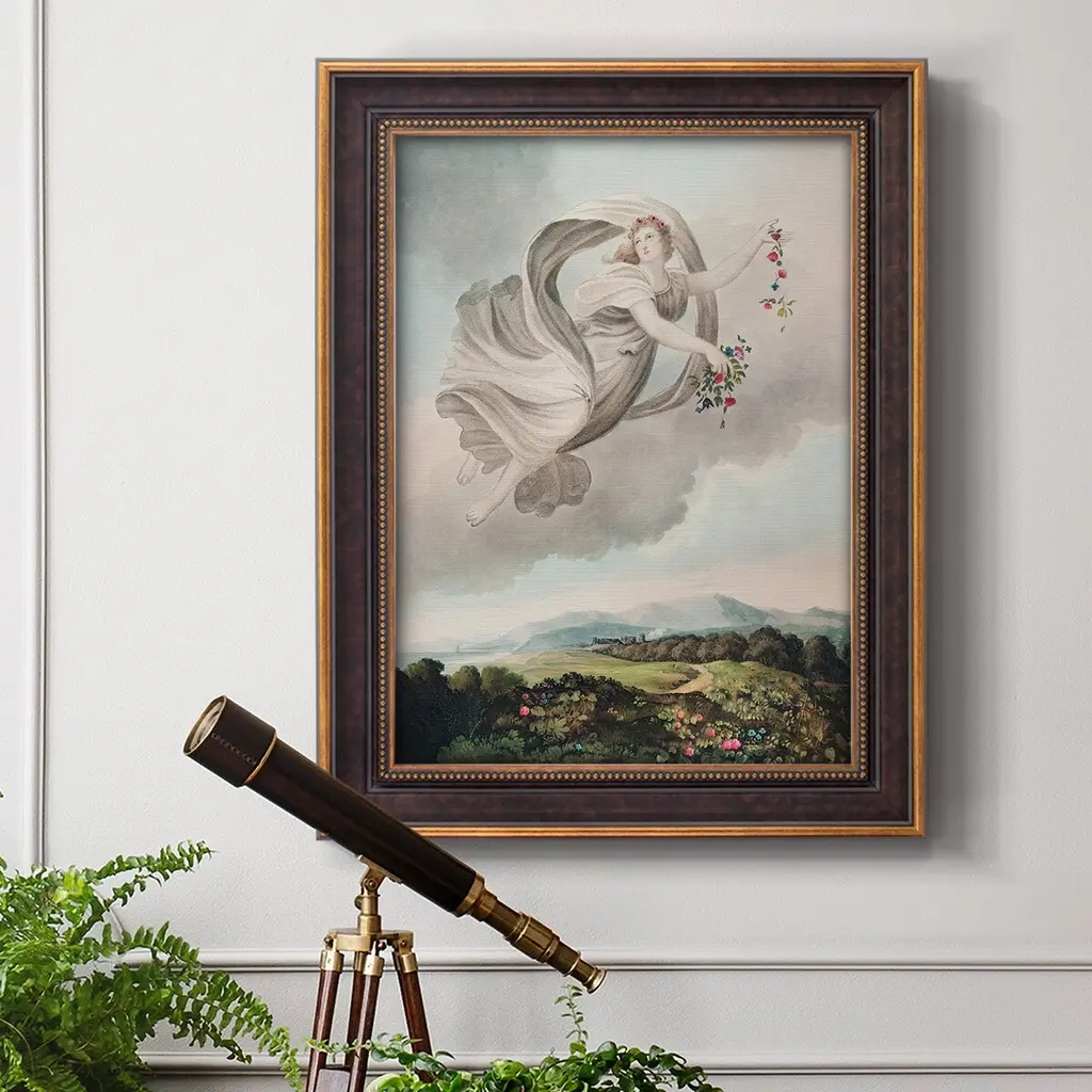 flora dispensing her favours Premium Framed Canvas- Ready to Hang A Premium Framed Canvas created to last. Framed in distressed wood and available in an array of sizes and colors Featuring a beveled a solid wood stretcher bar, each piece comes ready to hand 3 SIZES AVAILABLE 16''X20'' - Overall Size 18'X27'' - Overall Size 24''x36'' - Overall Size Each piece is made to order. Each piece comes with hanging hardware. Made in the USA Ready to Hang Giclee Paper Print Acrylic Glass Beveled Matt Board