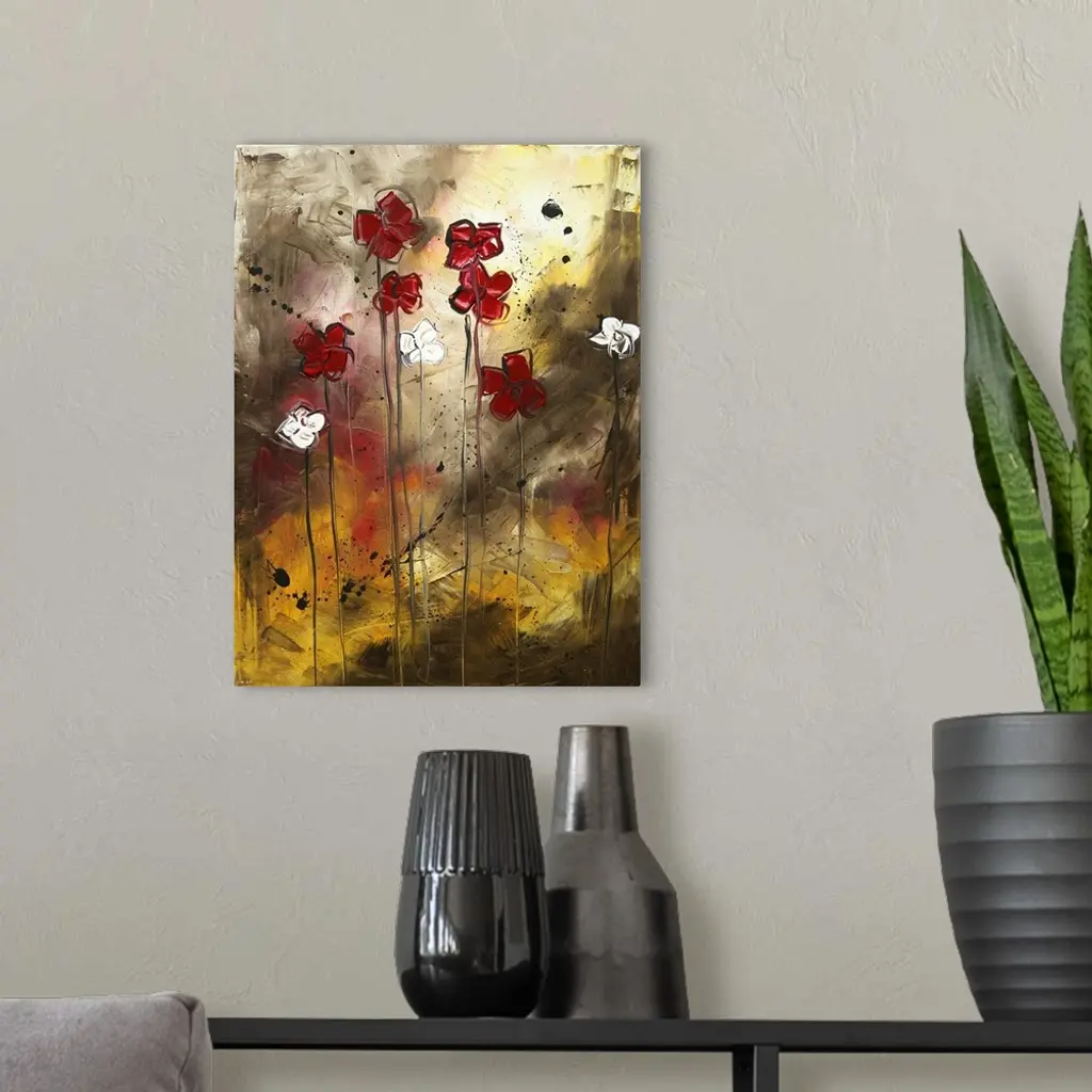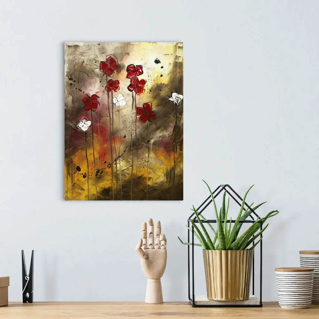 Big, vertical, contemporary painting of a small grouping of flowers standing upright, on long, thin stems. On a textured background of layered, thick brushstrokes in many directions and random, small splatters of paint.
