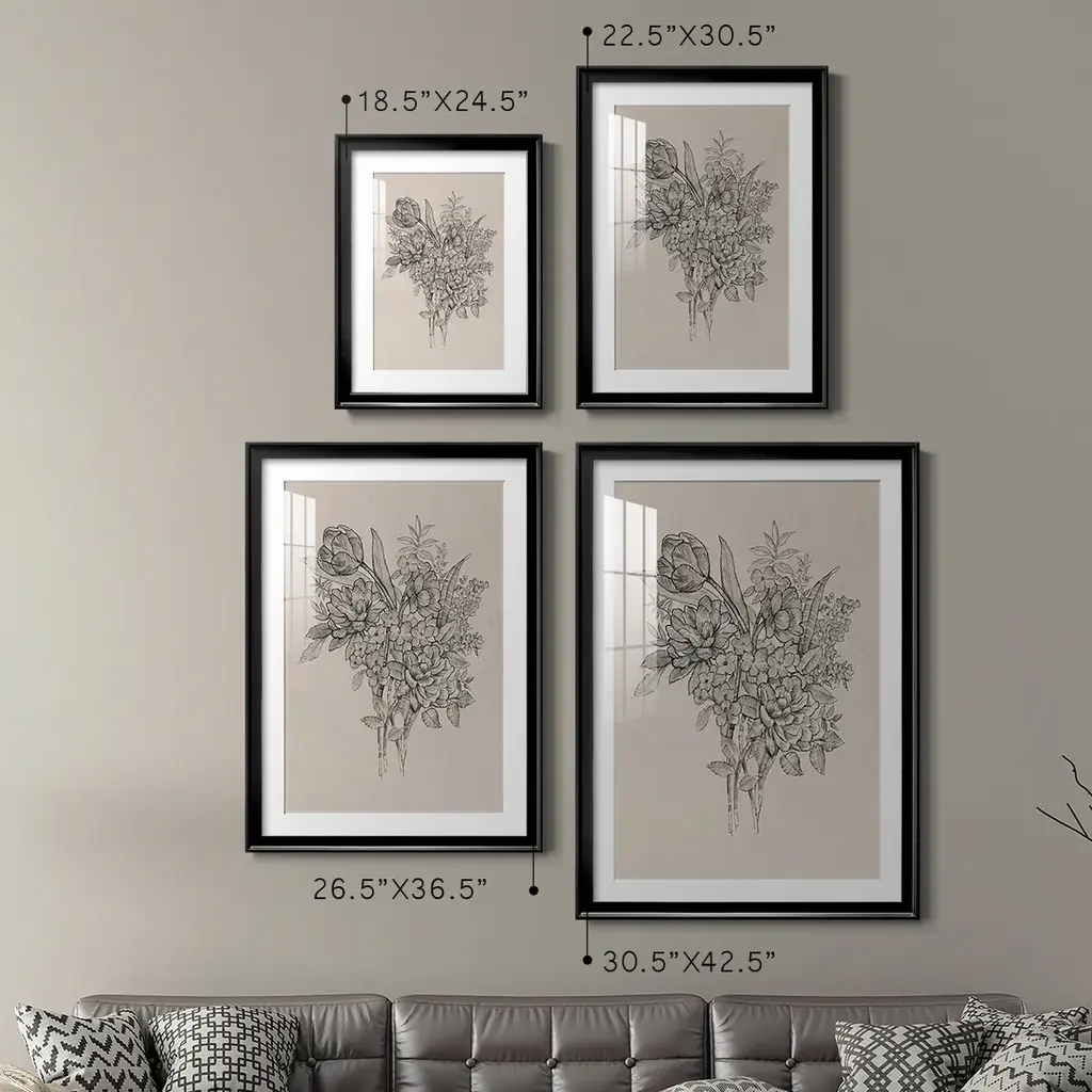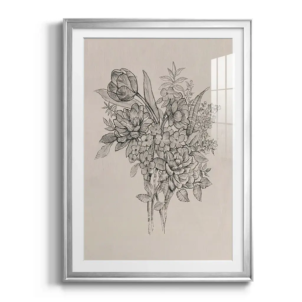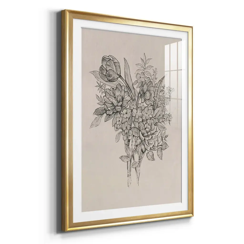 Floral Bouquet I Premium Framed Print - Ready to Hang A Premium Framed Print created to last. Framed in distressed wood and available in an array of sizes and colors Featuring a beveled a solid wood stretcher bar, each piece comes ready to hand 4 SIZES AVAILABLE 30.5''X42.5'' - Overall Size 26.5'X36.5'' - Overall Size 22.5''x30.5'' - Overall Size 18.5''x24.5'' - Overall Size Each piece is made to order. Each piece comes with hanging hardware. Made in the USA Ready to Hang Giclee Paper Print Acrylic Glass Beveled Matt Board