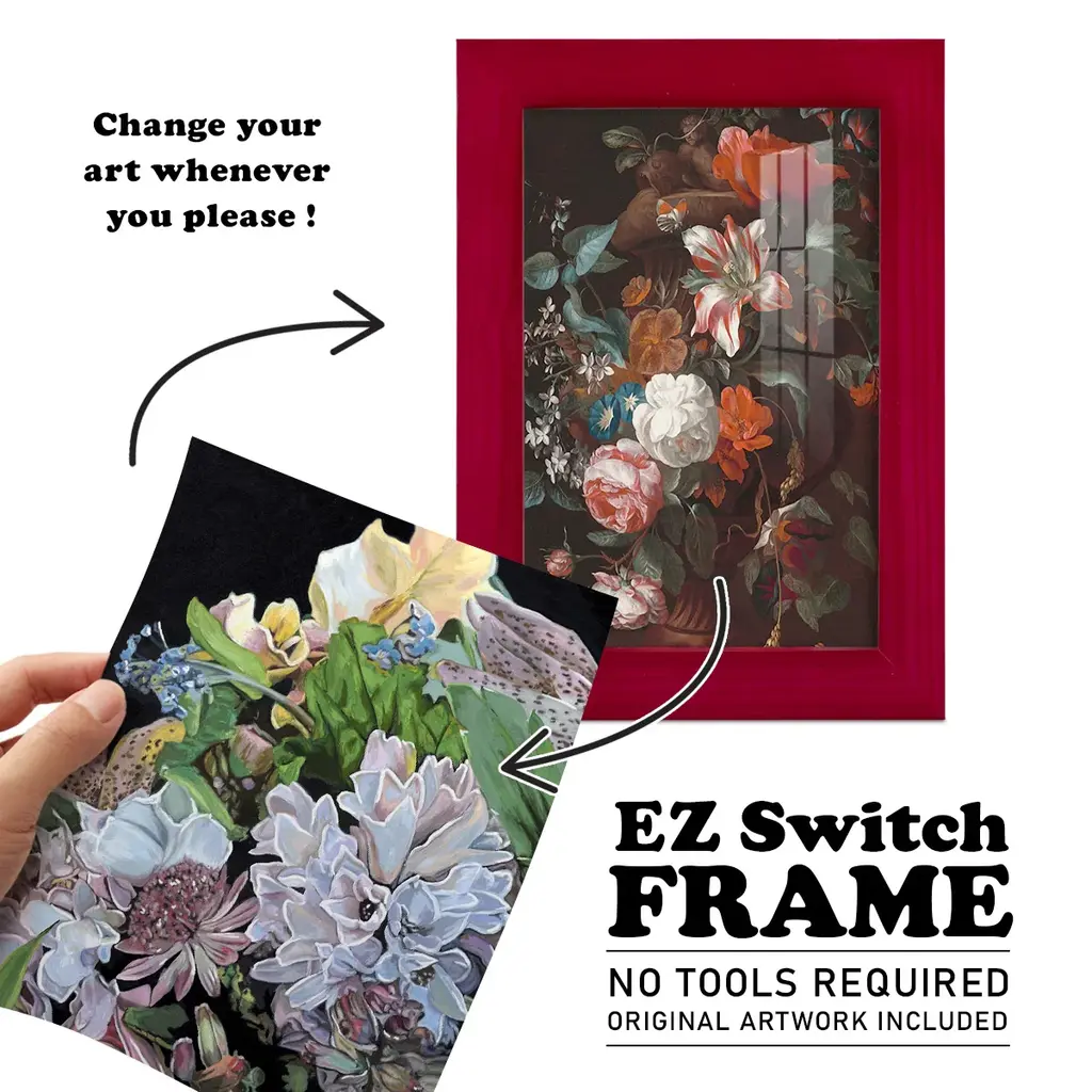 Floral Crop I -EZ SWITCH Framed Print w/glass-Cherry Red A delightful, framed print. Featuring a solid wood frame with real wood glass. This premium print is giclee quality. In addition, every frame features a removable back and table top stand. This allows you to change your art in the future or to just stand the art on a table for a new look. We are sure you'll enjoy our new series of EZ SWITCH Framed Art. Solid Wood Frame Real Glass Removable / Replaceable Art Built in Tabletop Stand Sizes range from 4x6 up to 12x15 - buy just one or pair them up as sets as you see fit.