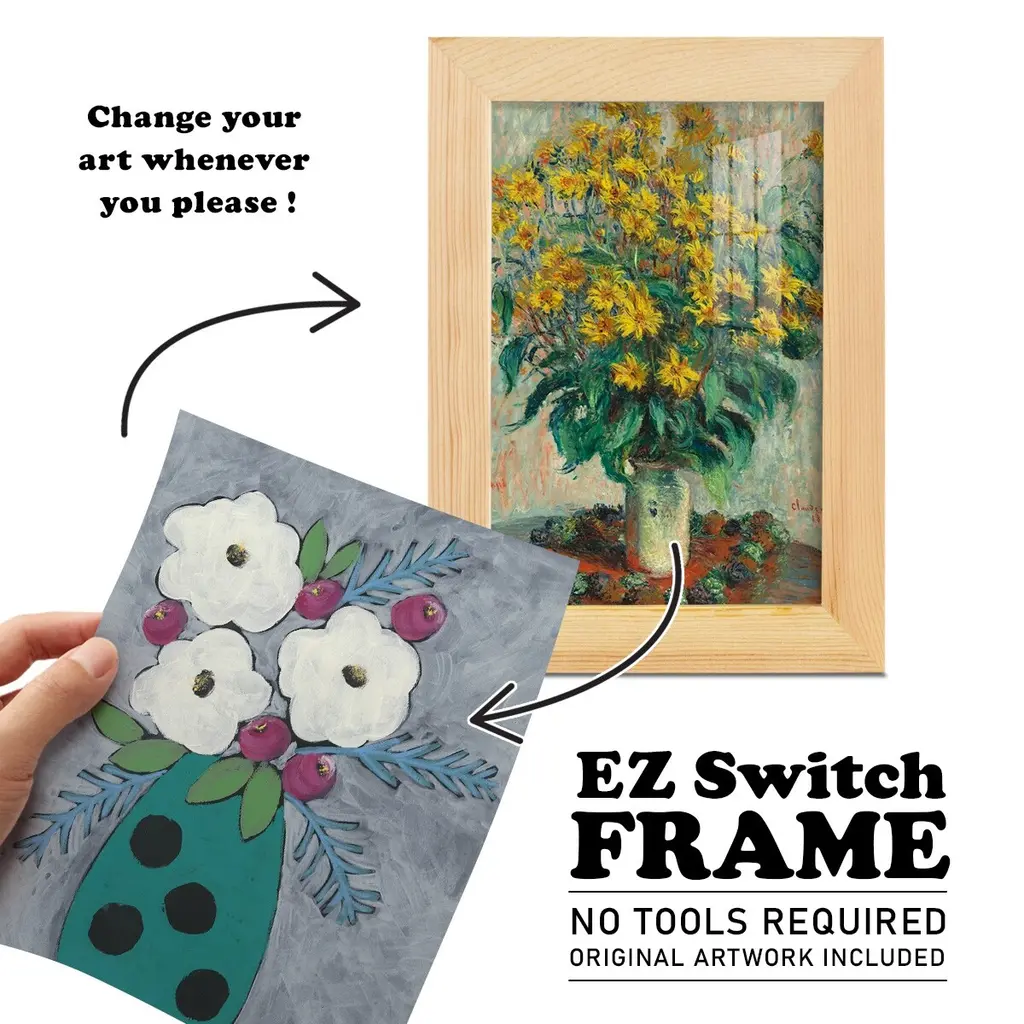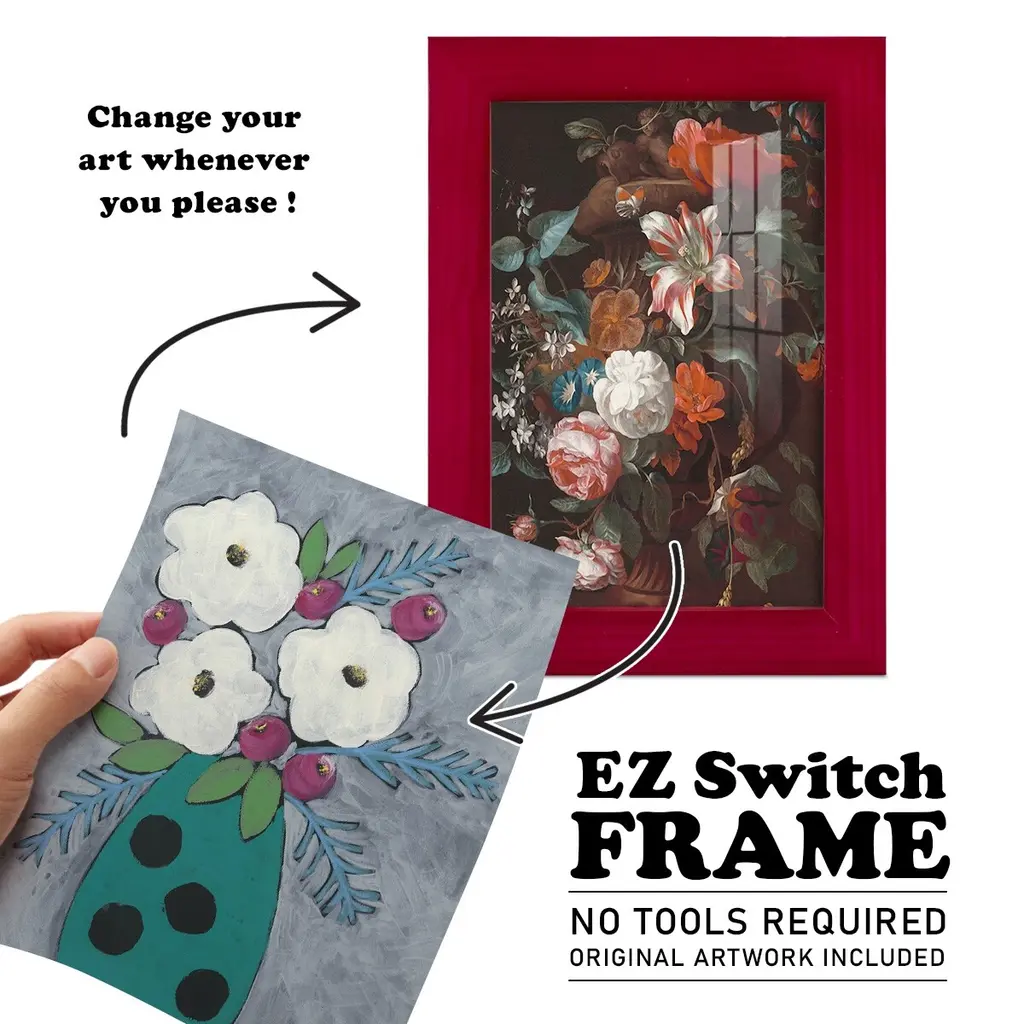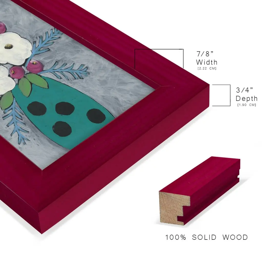 Floral Frolic II -EZ SWITCH Framed Print w/glass-Cherry Red A delightful, framed print. Featuring a solid wood frame with real wood glass. This premium print is giclee quality. In addition, every frame features a removable back and table top stand. This allows you to change your art in the future or to just stand the art on a table for a new look. We are sure you'll enjoy our new series of EZ SWITCH Framed Art. Solid Wood Frame Real Glass Removable / Replaceable Art Built in Tabletop Stand Sizes range from 4x6 up to 12x15 - buy just one or pair them up as sets as you see fit.