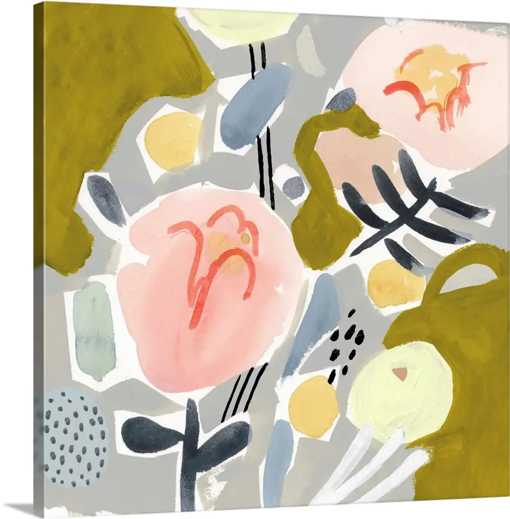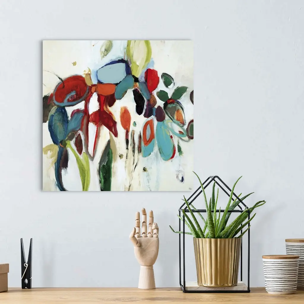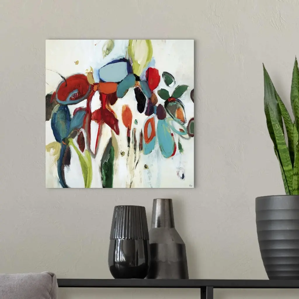 Abstract painting of organic shapes in multiple and vivid colors arranged like a bouquet of flowers.