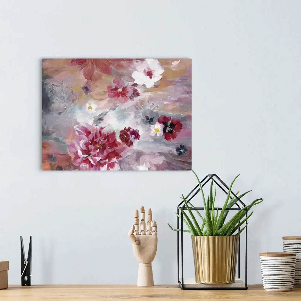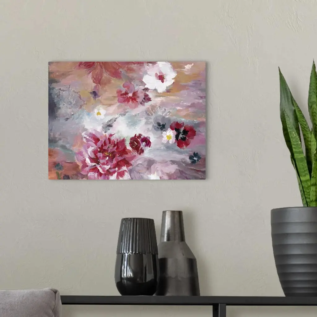 Contemporary artwork of vibrant red and soft pink flowers against a red and pale blue background.