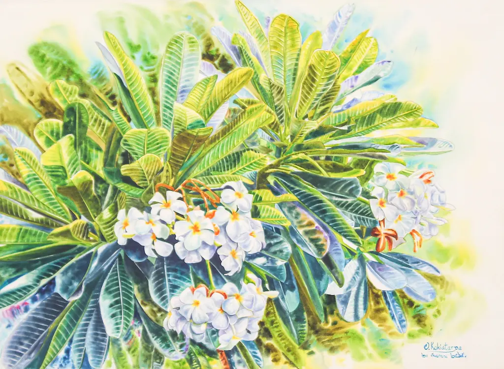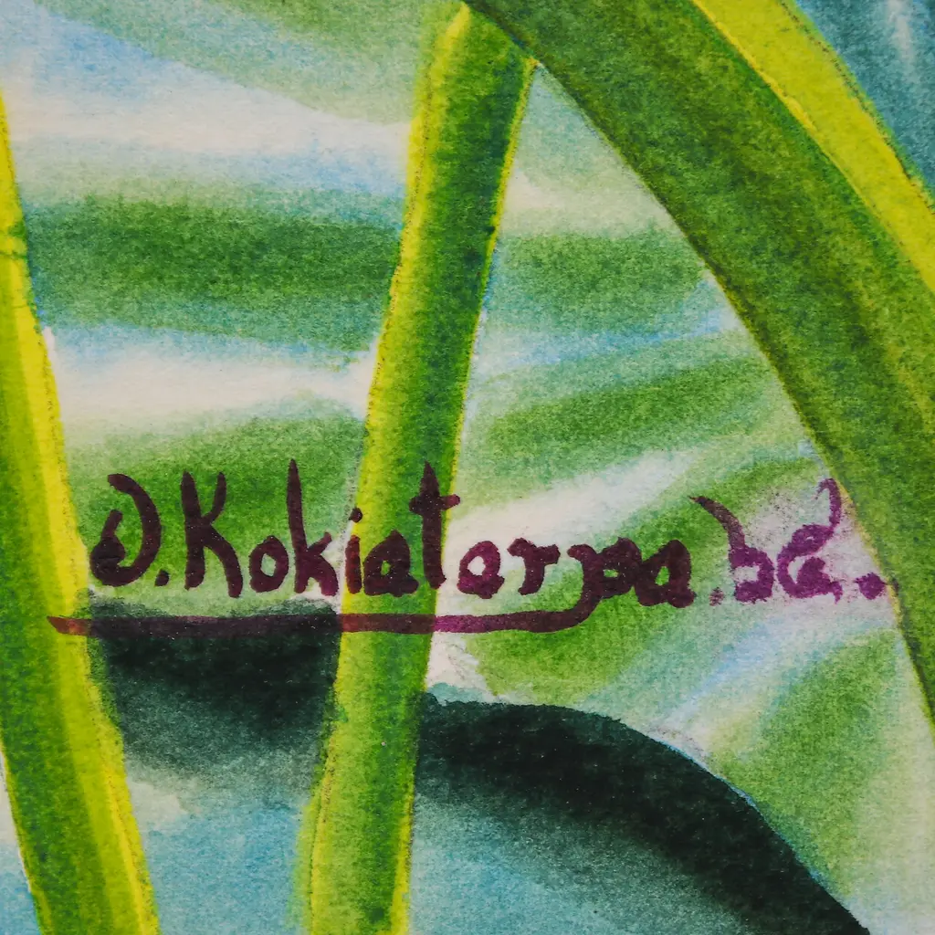 A sweet lotus flower rests peacefully in an impressionist scene painted by Chirawat from Thailand. Drawing inspiration from nature, the artist uses green and pink watercolors on paper to create a sublime work depicting a serene pond full of vegetation.This enchanting artwork is signed by the artist and comes stretched.