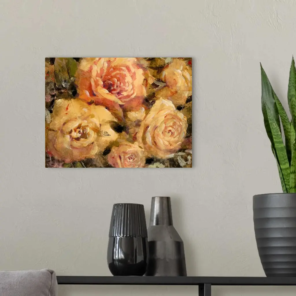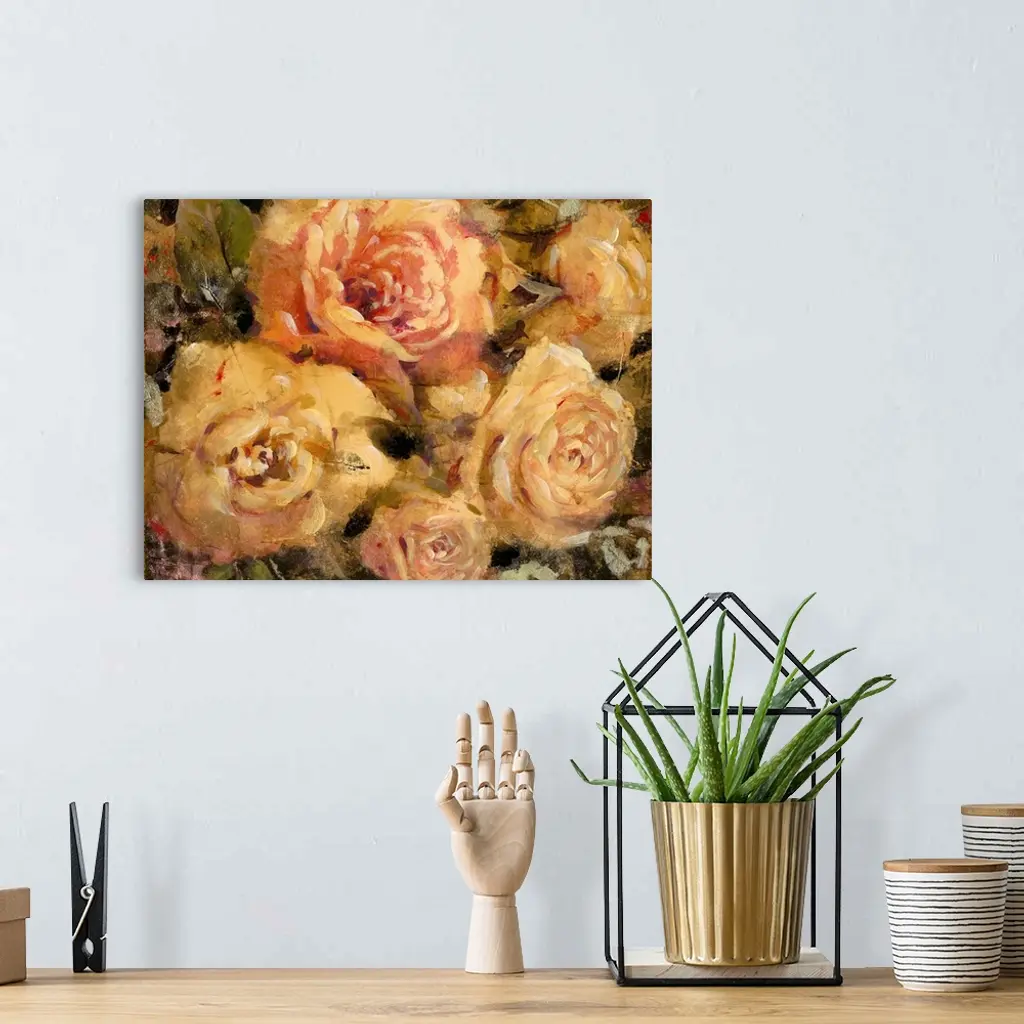 Contemporary artwork of of roses in bloom, in vintage shades of pink and yellow.