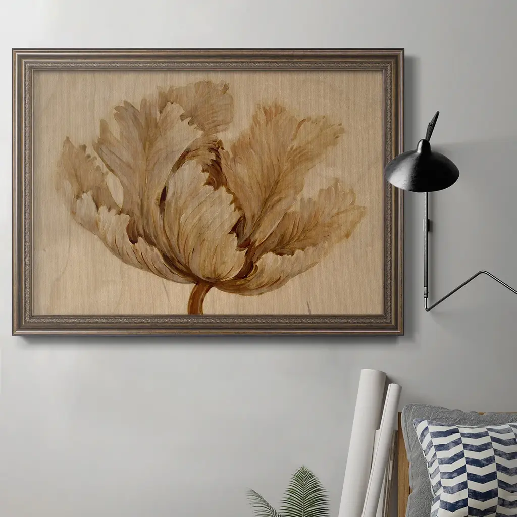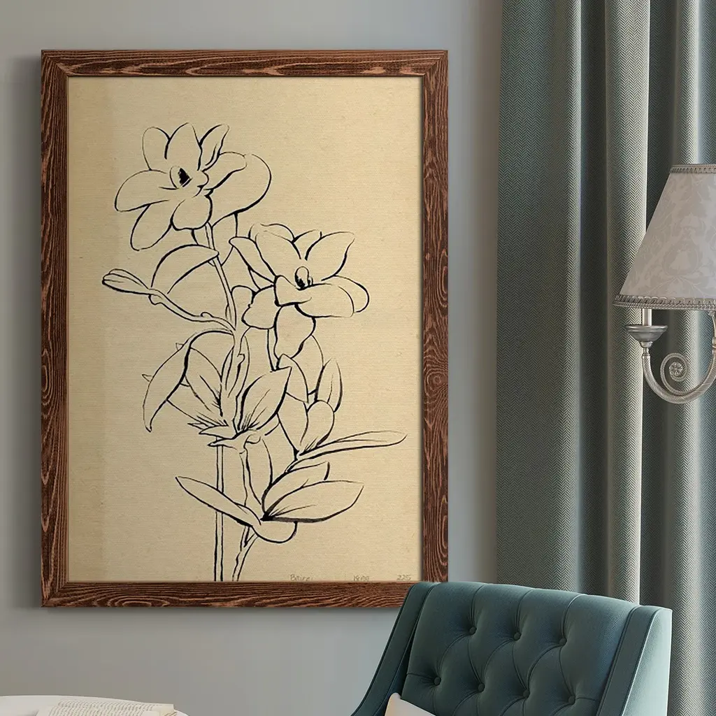Designed by us and available only at One Kings Lane: A simple floral drawing is reproduced here on deckled matte paper and floated over a neutral muslin-wrapped mat. Displayed under glass in an antiqued gold frame, this piece arrives ready to hang.