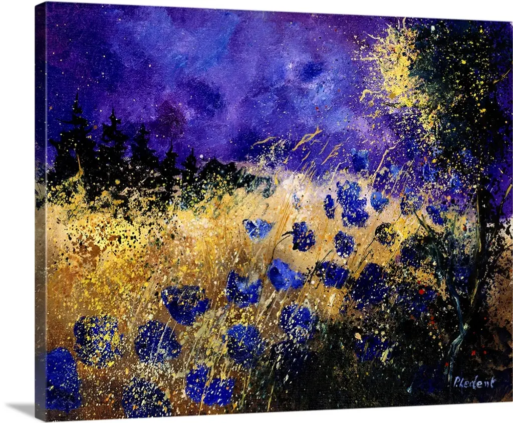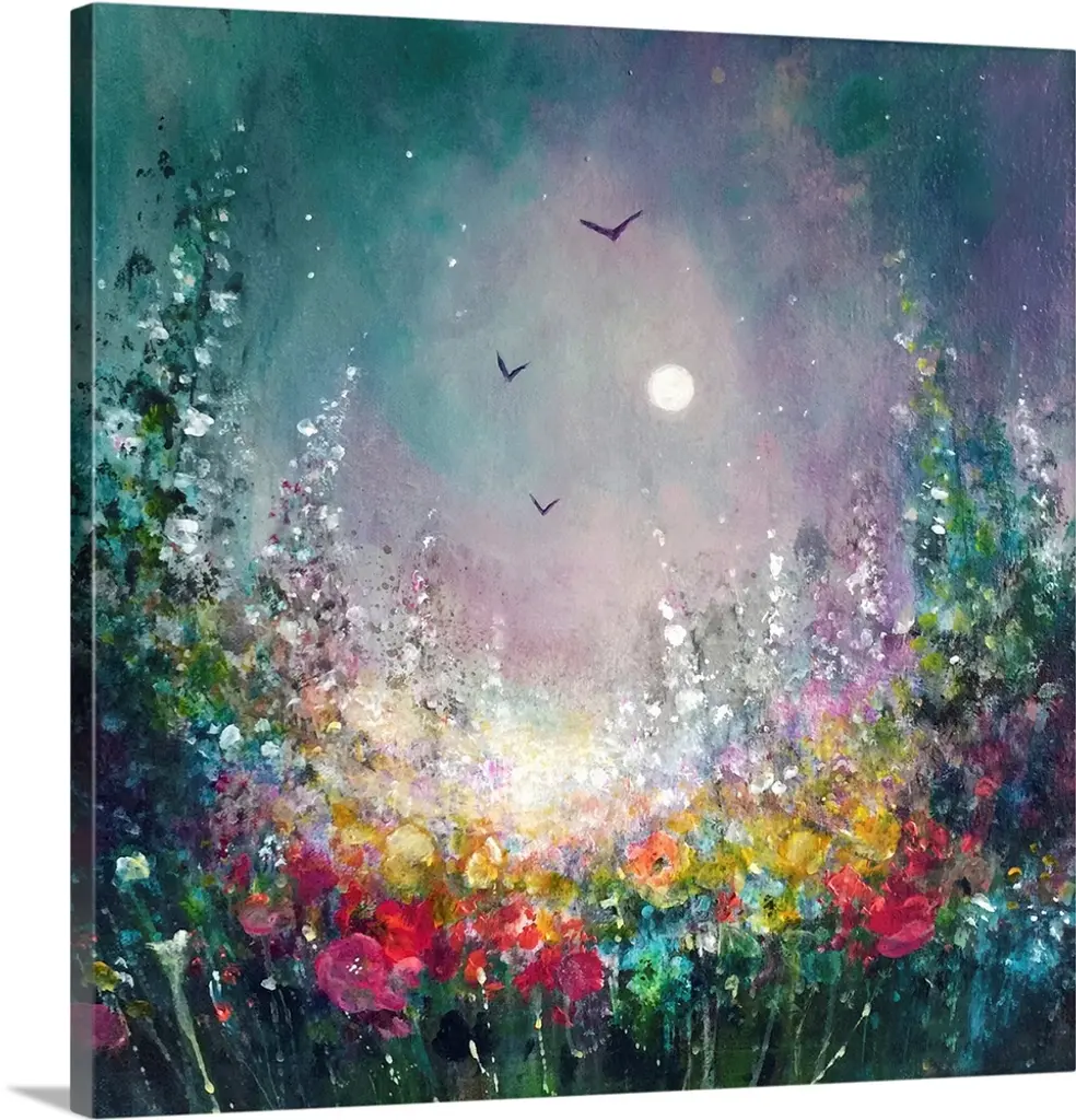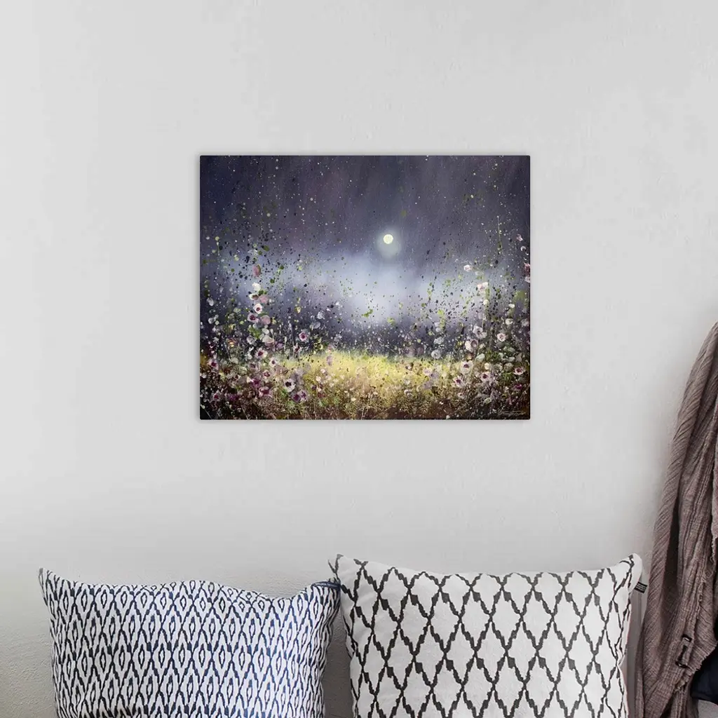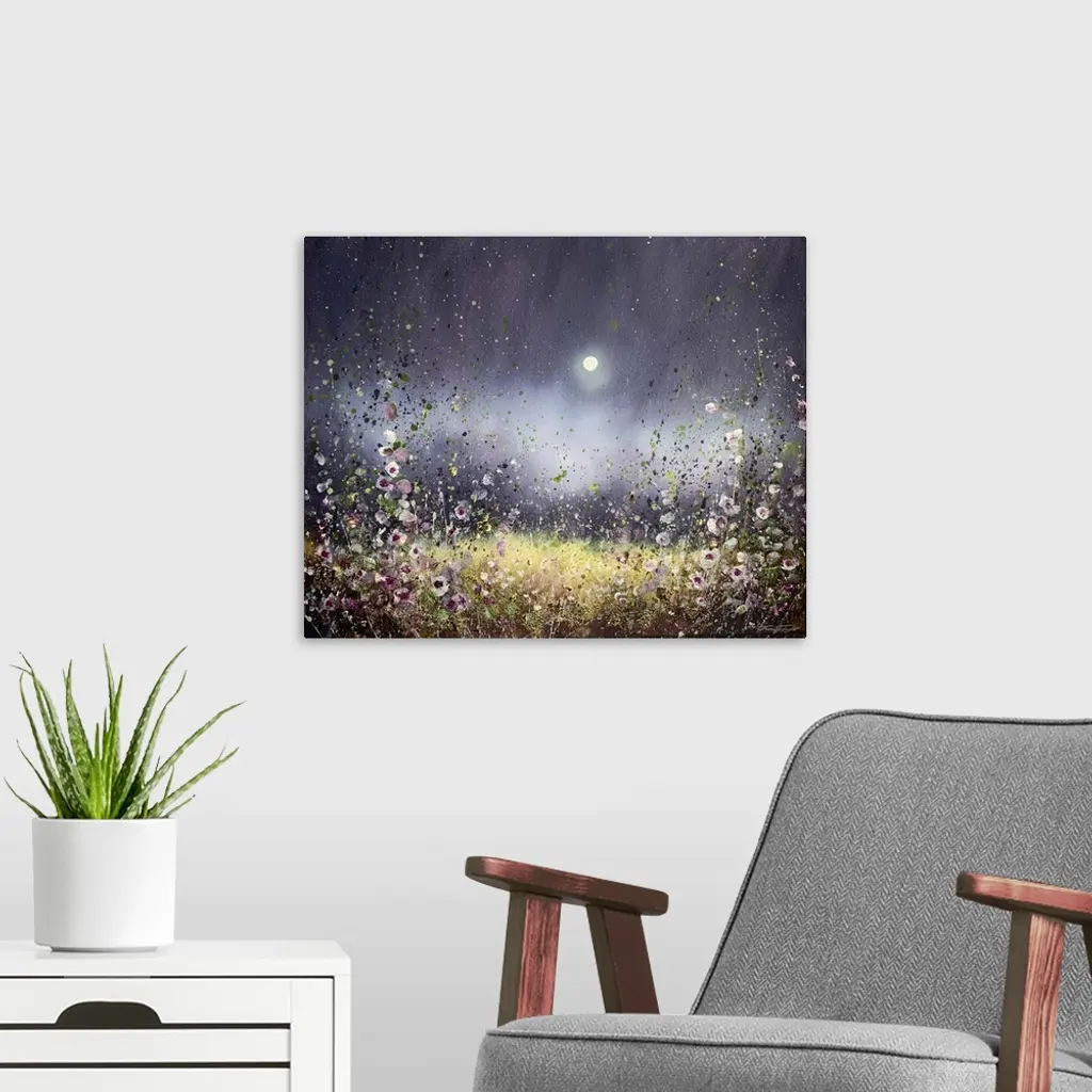 A transitional style painting of sparse wildflowers under a night sky with a full moon. Painted in a romantic and feminine style