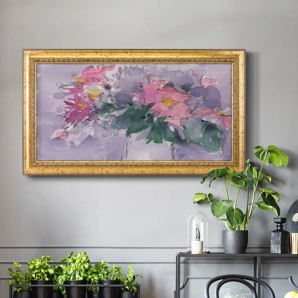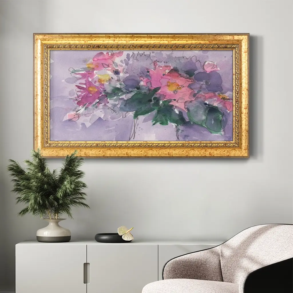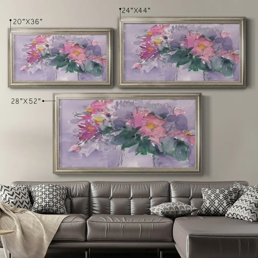 Floral Occasion I Premium Framed Canvas- Ready to Hang A Premium Framed Canvas created to last. Framed in distressed wood and available in an array of sizes and colors Featuring a beveled a solid wood stretcher bar, each piece comes ready to hand 3 SIZES AVAILABLE 21''X37'' - Overall Size 25''X45'' - Overall Size 29''x53'' - Overall Size Each piece is made to order. Each piece comes with hanging hardware. Made in the USA Ready to Hang Giclee Paper Print Acrylic Glass Beveled Matt Board