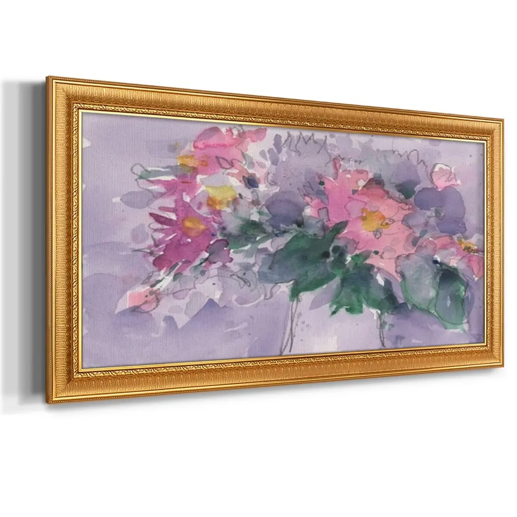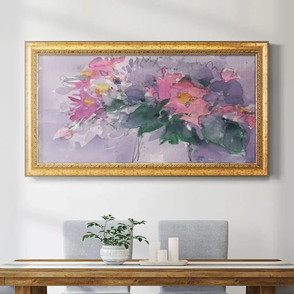 Floral Occasion I Premium Framed Canvas- Ready to Hang A Premium Framed Canvas created to last. Framed in distressed wood and available in an array of sizes and colors Featuring a beveled a solid wood stretcher bar, each piece comes ready to hand 3 SIZES AVAILABLE 21''X37'' - Overall Size 25''X45'' - Overall Size 29''x53'' - Overall Size Each piece is made to order. Each piece comes with hanging hardware. Made in the USA Ready to Hang Giclee Paper Print Acrylic Glass Beveled Matt Board