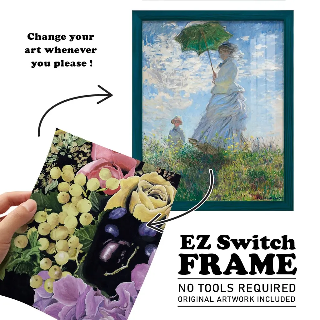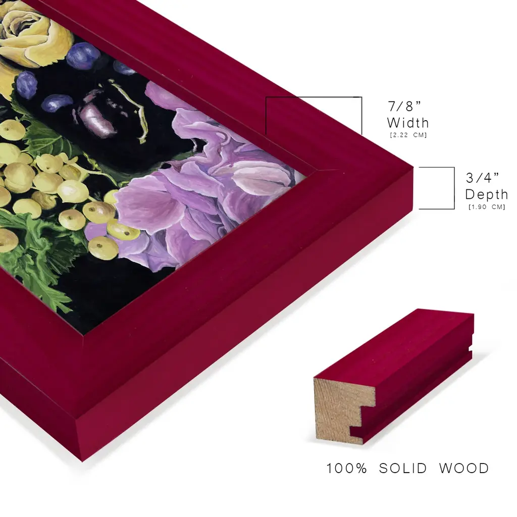 Floral on Black I -EZ SWITCH Framed Print w/glass-Cherry Red A delightful, framed print. Featuring a solid wood frame with real wood glass. This premium print is giclee quality. In addition, every frame features a removable back and table top stand. This allows you to change your art in the future or to just stand the art on a table for a new look. We are sure you'll enjoy our new series of EZ SWITCH Framed Art. Solid Wood Frame Real Glass Removable / Replaceable Art Built in Tabletop Stand Sizes range from 4x6 up to 12x15 - buy just one or pair them up as sets as you see fit.