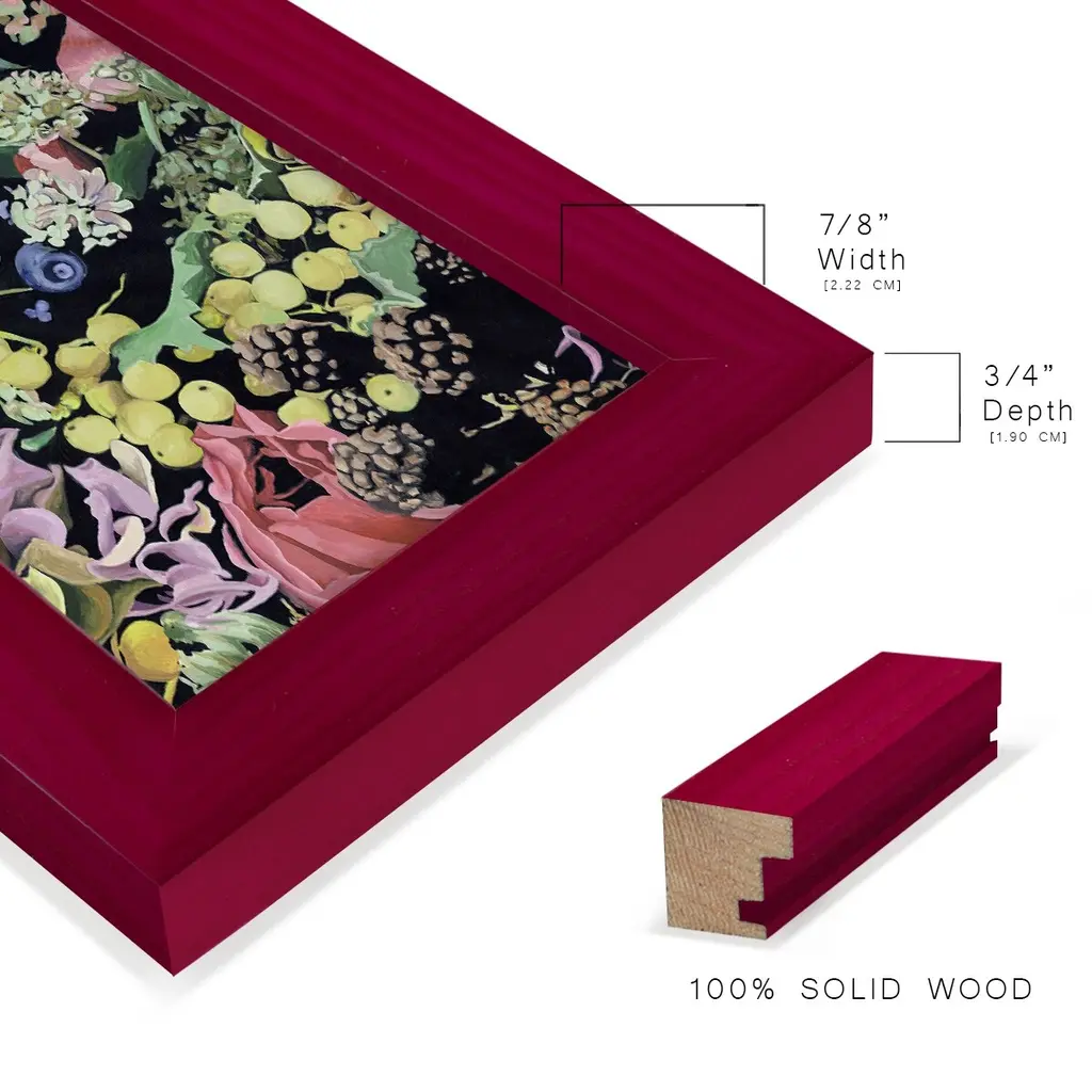 Floral on Black II -EZ SWITCH Framed Print w/glass-Cherry Red A delightful, framed print. Featuring a solid wood frame with real wood glass. This premium print is giclee quality. In addition, every frame features a removable back and table top stand. This allows you to change your art in the future or to just stand the art on a table for a new look. We are sure you'll enjoy our new series of EZ SWITCH Framed Art. Solid Wood Frame Real Glass Removable / Replaceable Art Built in Tabletop Stand Sizes range from 4x6 up to 12x15 - buy just one or pair them up as sets as you see fit.