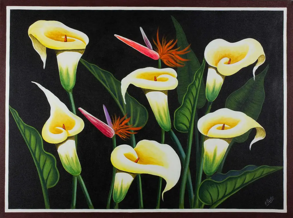 "This painting is inspired by the flowers that are cultivated near my village. They remind me of how beautiful my Guatemala is," confides Juan Henry Mendez. He refers to the exotic beauty of calla lilies and birds of paradise, which he captures with artistic finesse as he paints with oils and acrylics.Titled "Cartuchos" in Spanish.